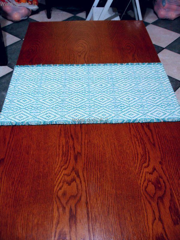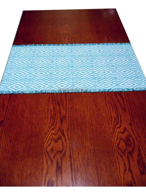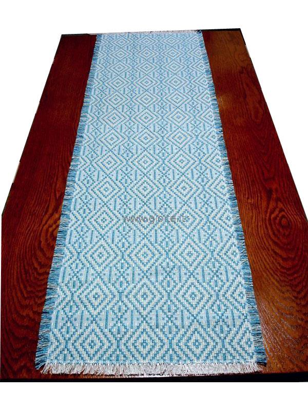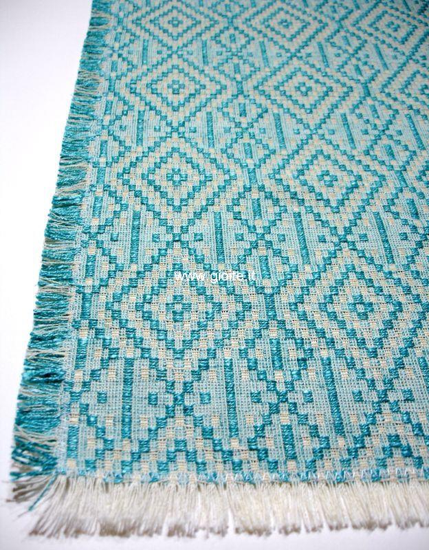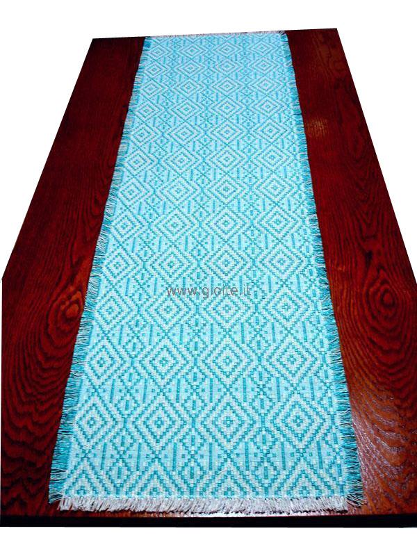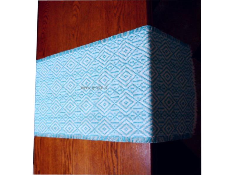 Runner - guida da tavola in filo perlato di colore: blu, celeste, turchese chiaro. Tessuto operato a rombi incastrati, molto armonioso ed elegante. Si adatta a tutte le esigenze di arredo. Manufatto resistente, lavabile in lavatrice a 60° candeggiare per colori.