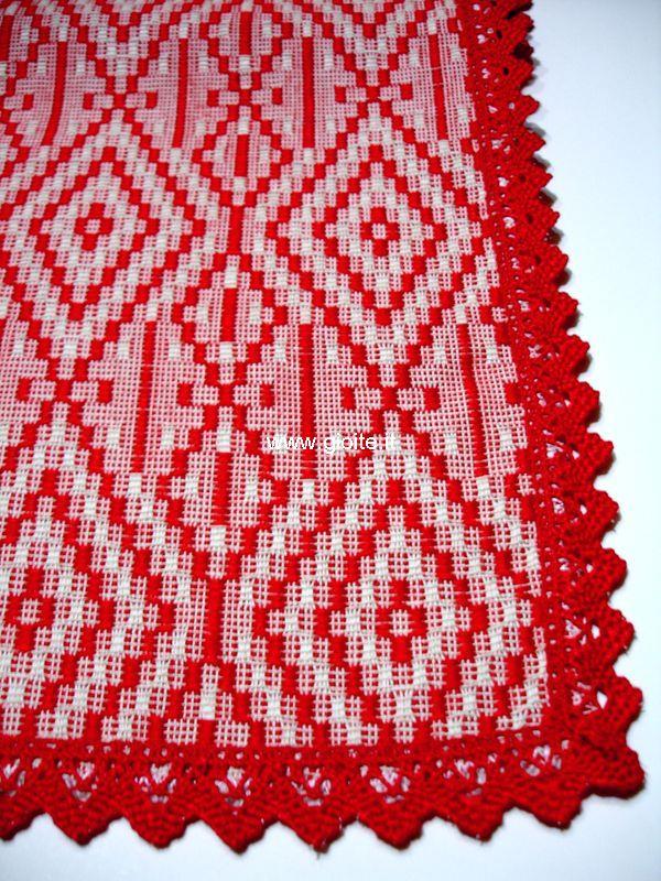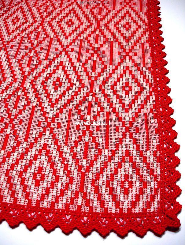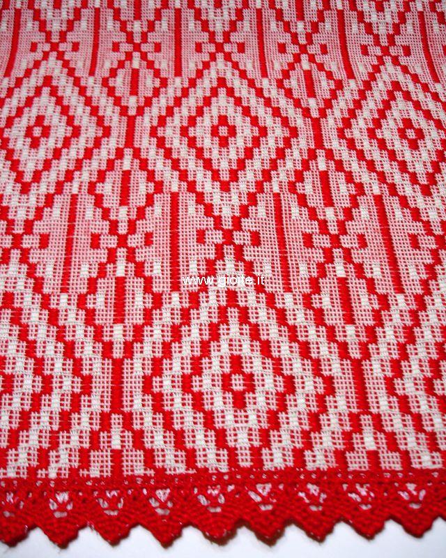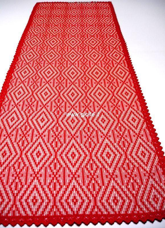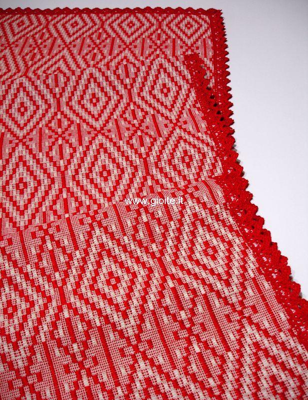 Runner - guida da tavola in filo perlato di colore rosso rifinito con pizzo rosso. Tessuto operato a rombi incastrati, molto armonioso ed elegante. Si adatta a tutte le esigenze di arredo. Manufatto resistente, lavabile in lavatrice a 60° candeggiare per colori.
