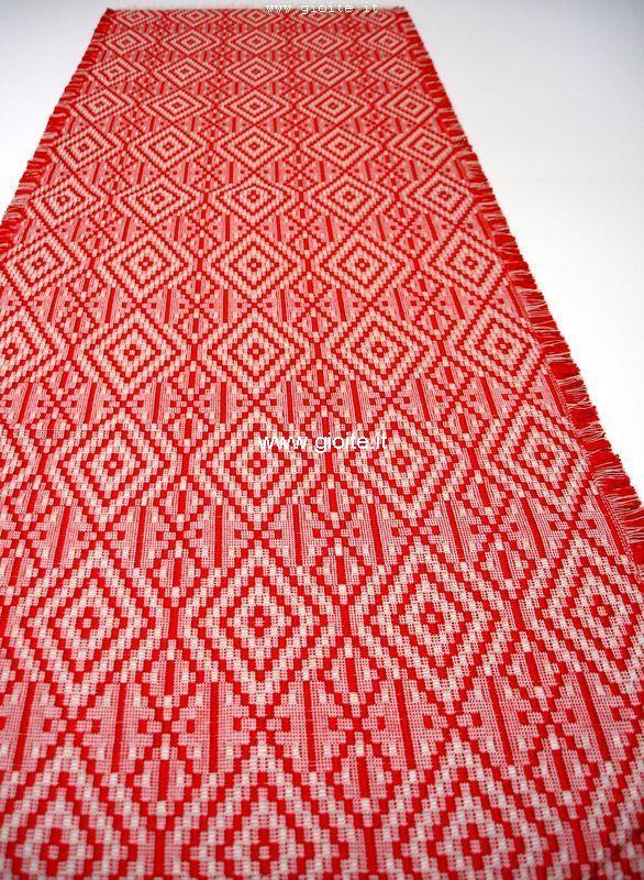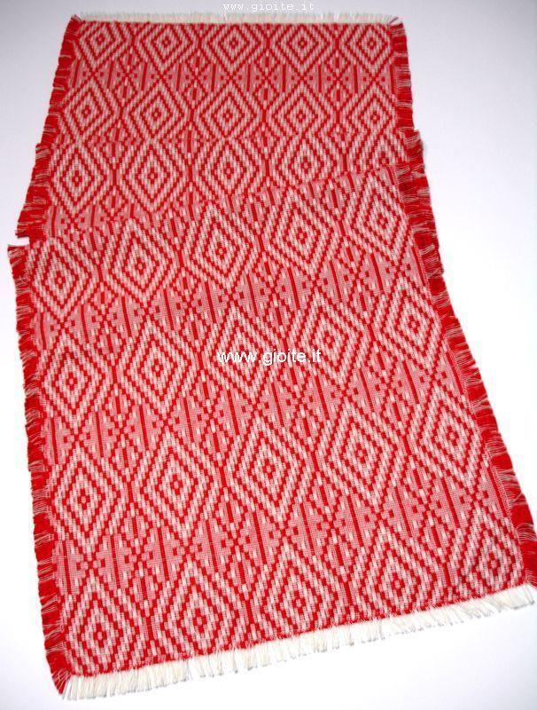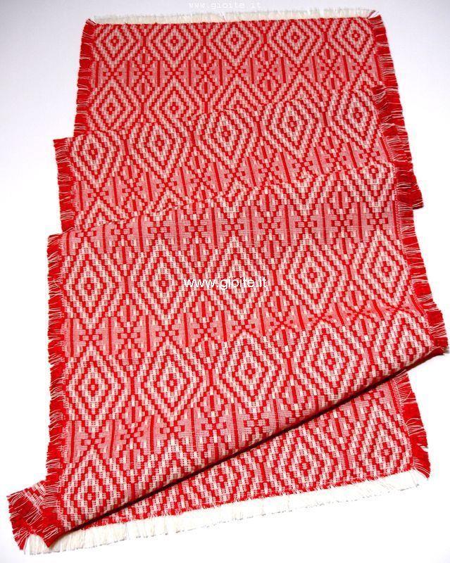 Guida da tavolo o runner in cotone rosso, motivo detto a rombi uno dentro l'altro. Il tessuto è in trama cotone di colore rosso e l'ordito di colore avorio naturale del cotone, attraverso questo procedimento si rende più visibile il motivo decorativo. E' un tessuto morbido resistente, si lava in lavatrice a 60°.
