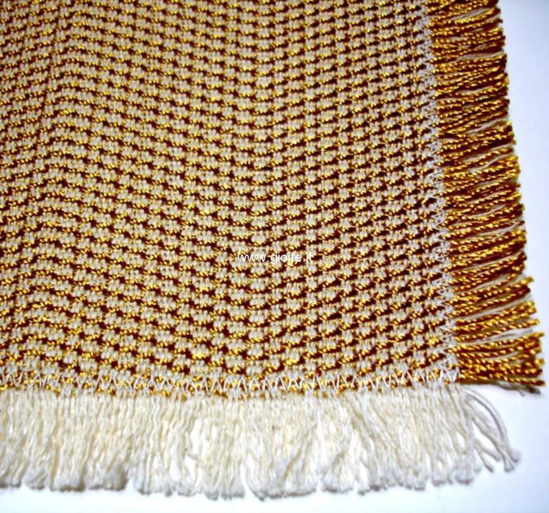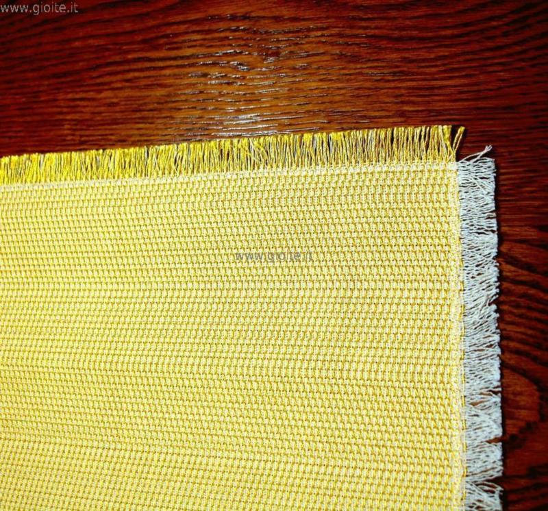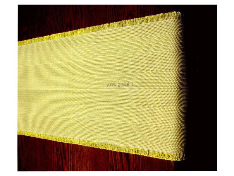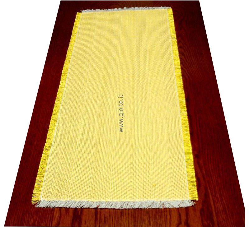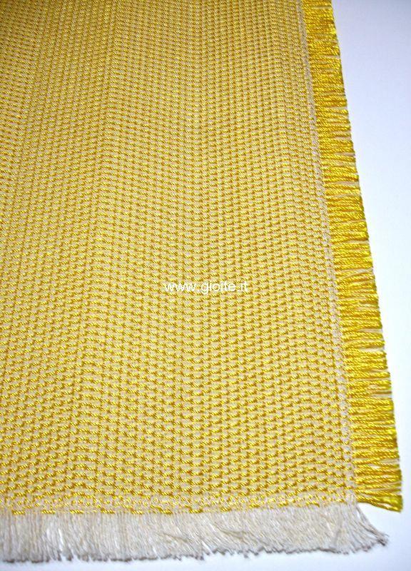 Guida da tavolo in seta colore oro, tessuto spigato ampio regolare, lateralmente sfrangiato. In trama Seta in ordito cotone naturale, questo per permettere al tessuto di avere una maggiore duratura nel tempo. Manufatto molto elegante, si lava in lavatrice senza centrifuga.