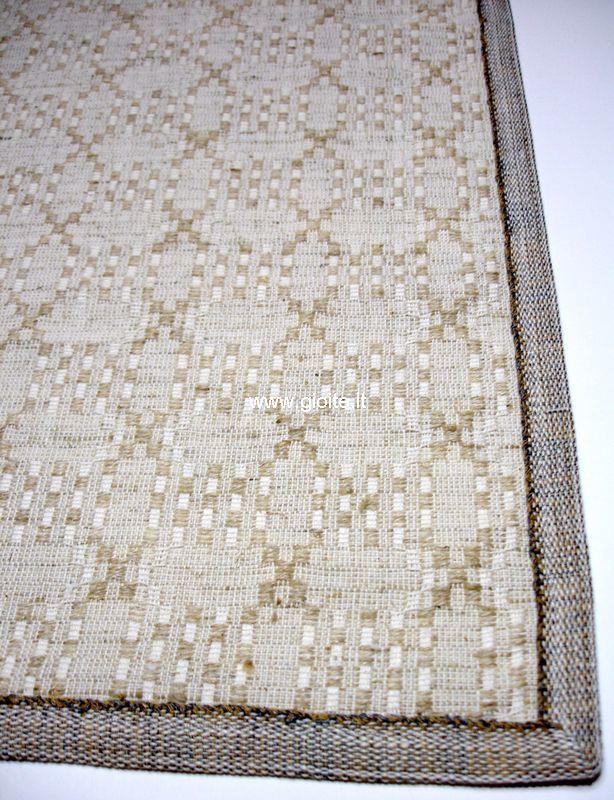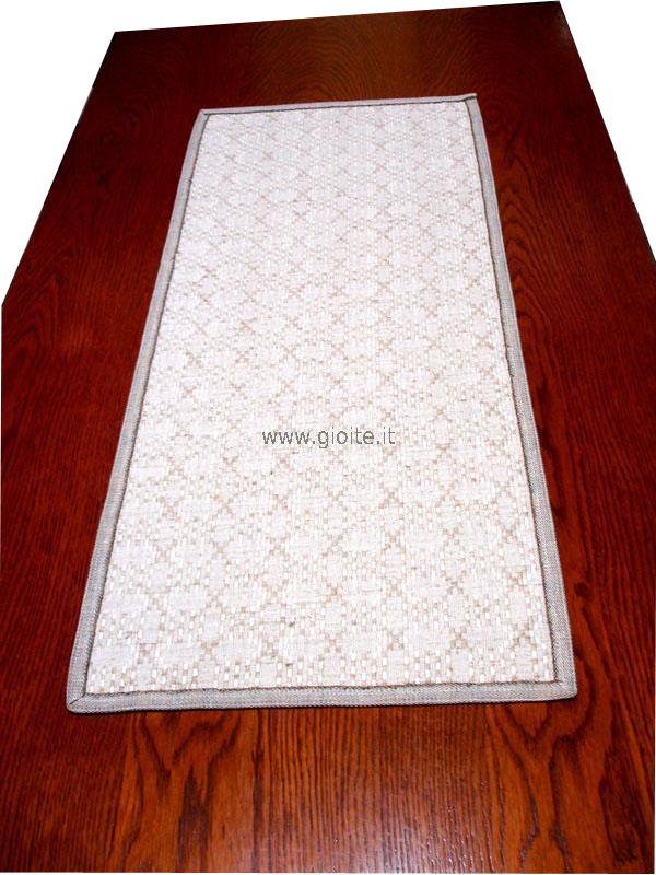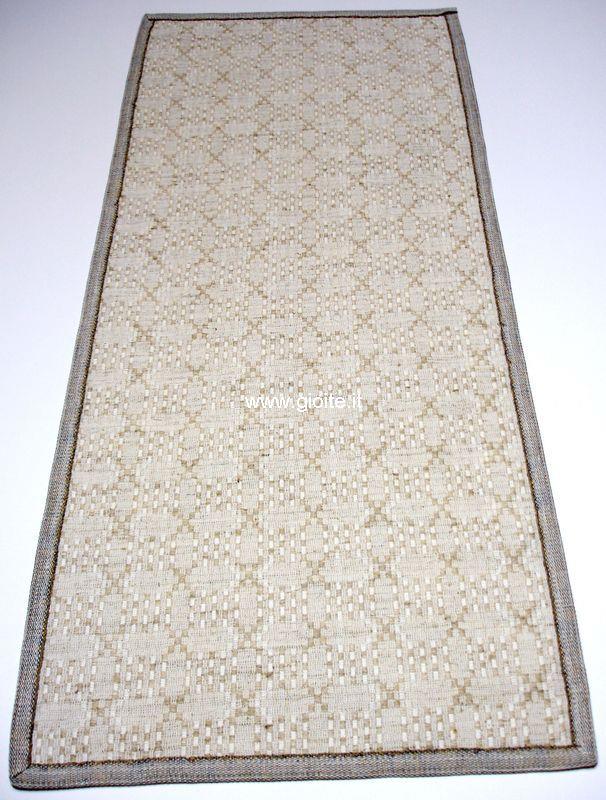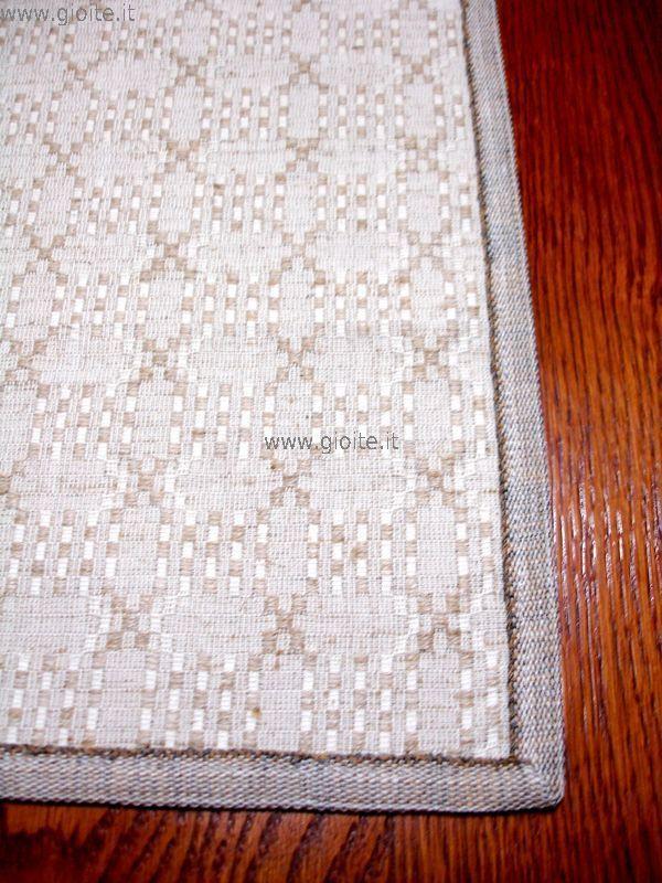 Runner e guida da tavolo, motivo detto mattonella per il suo intreccio particolare. Il tessuto è in trama lino e l'ordito di colore naturale, rifinito con nastro in cotone di cm 1,9 di colore naturale. Attraverso questo procedimento di intreccio si rende più visibile il motivo decorativo. E' un tessuto morbido resistente, si lava in lavatrice a 60° se si desidera mantenere il colore naturale, altrimenti si può lavare anche a temperature alte, schiarisce soltanto. Disponibile anche centro tavoli, vedere nelle varie classi.