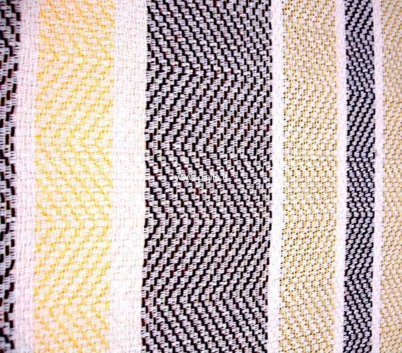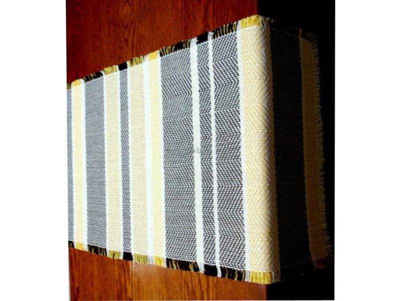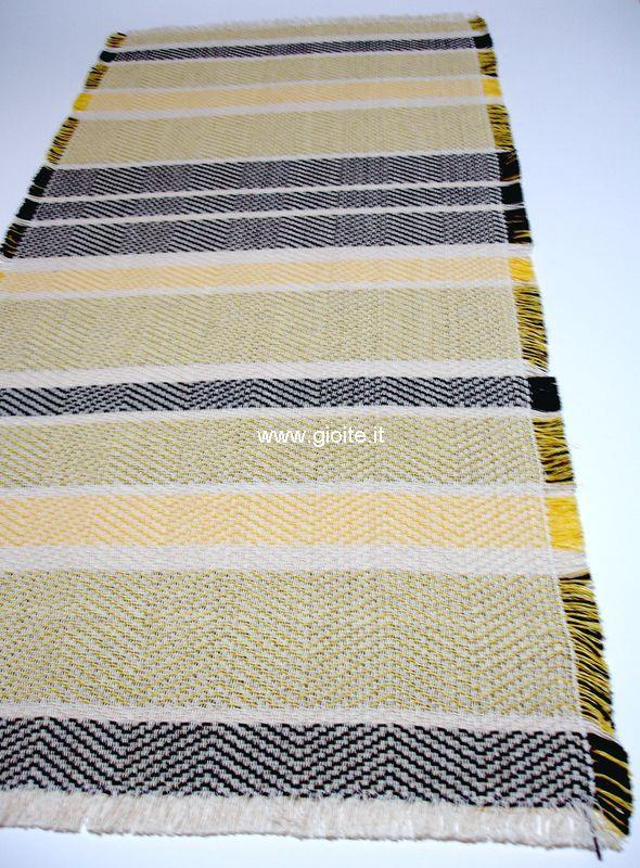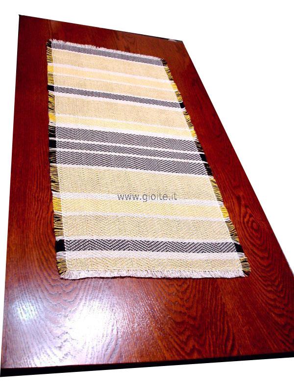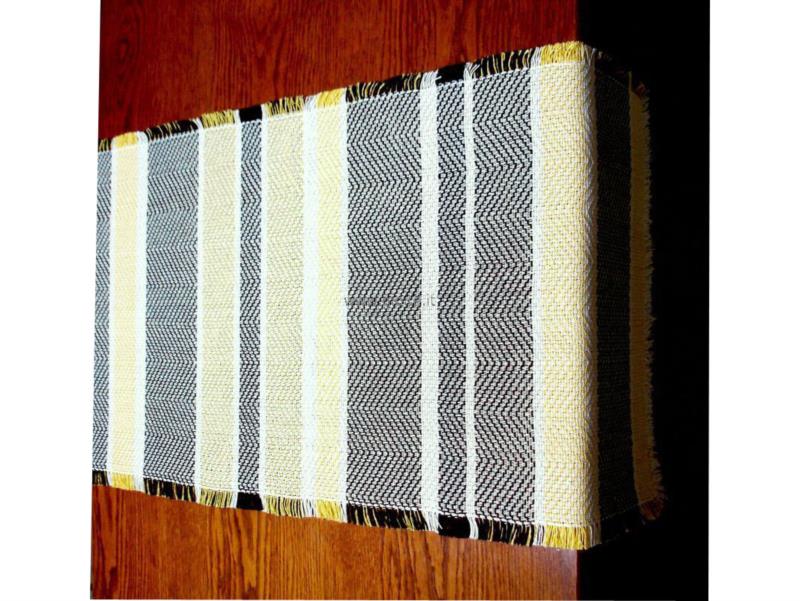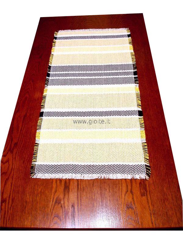 Guida da tavolo in cotone, tessuto spigato  a tre colori: marrone, avano e giallo è un tessuto doppio con alternanza di colori, da un lato prevale il colore giallo e dall'altro lato il colore marrone. Il tessuto e mobido e compatto, si lava in lavatrice a 40° senza centrifuga.