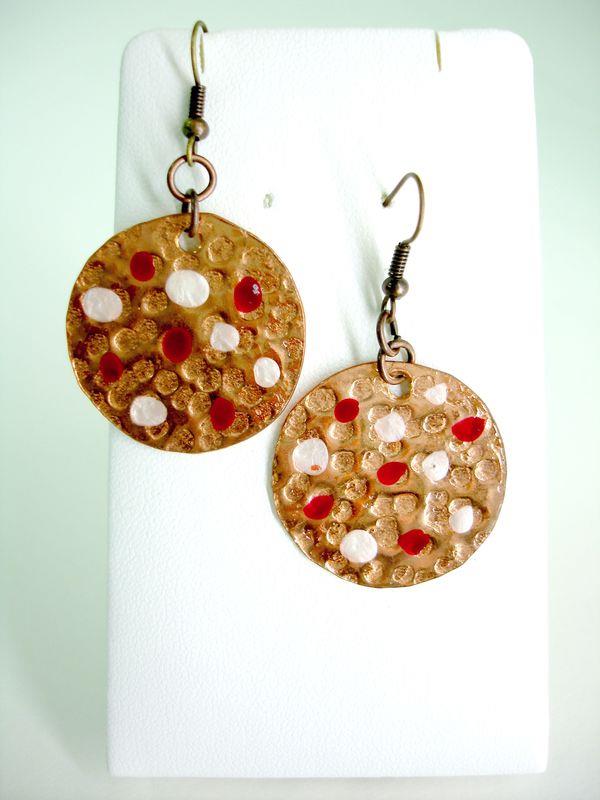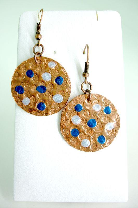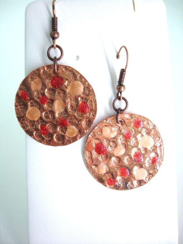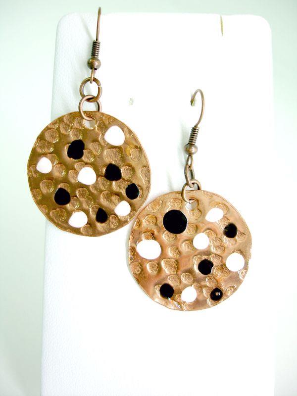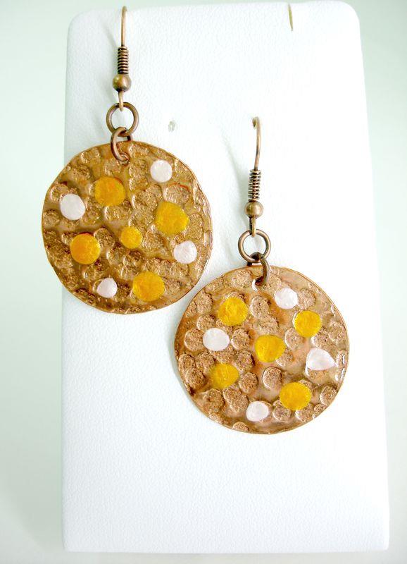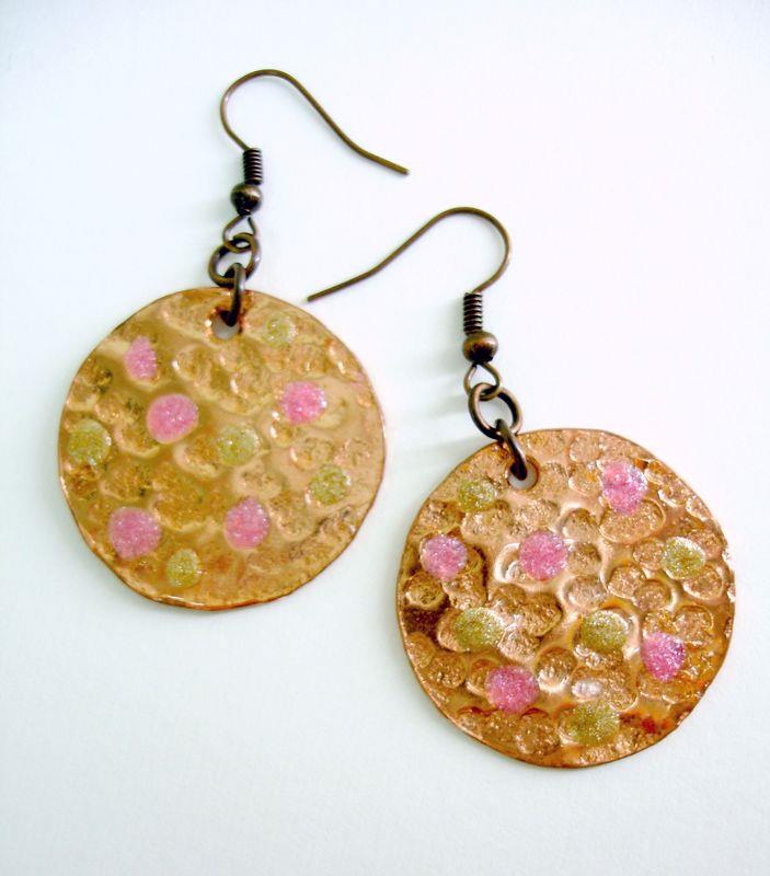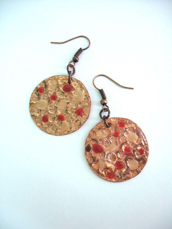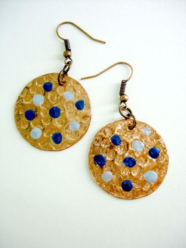 Orecchini pendenti in rame forma cerchio piccolo, martellato e smaltato diametro cm 3, con monachelle in rame , pezzi unici irripetibili. Il metallo essendo martellato sviluppa dei giochi di luce ed ombra, questo con la più piccola variazione di luce, illumina il viso. Ogni manufatto viene lavorato interamente a mano, il rame non si ossida rimane inalterato nel tempo.