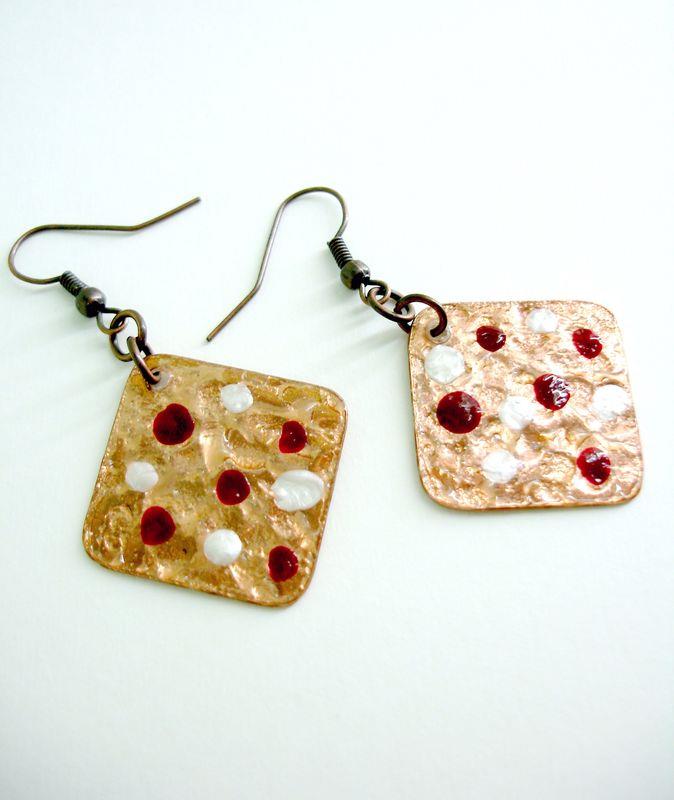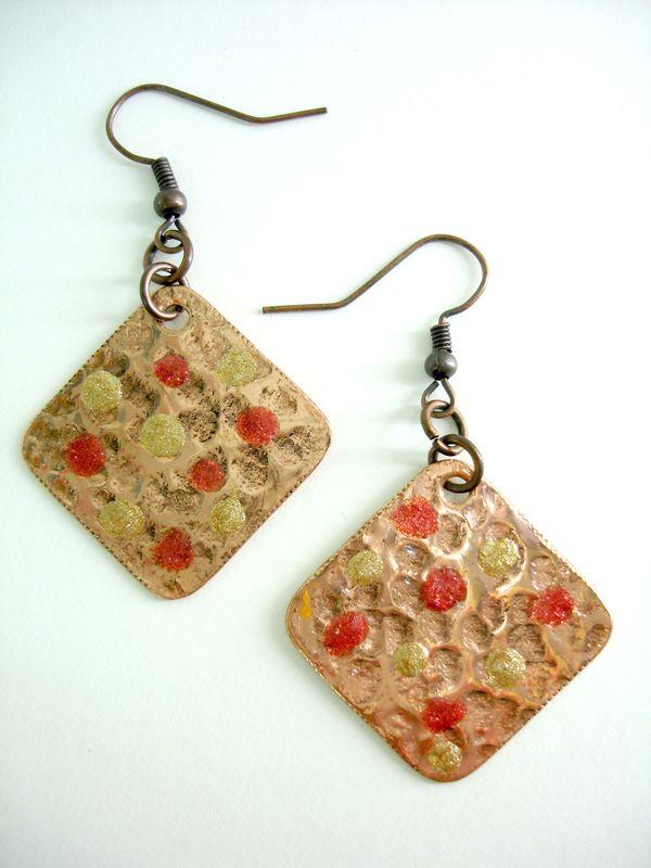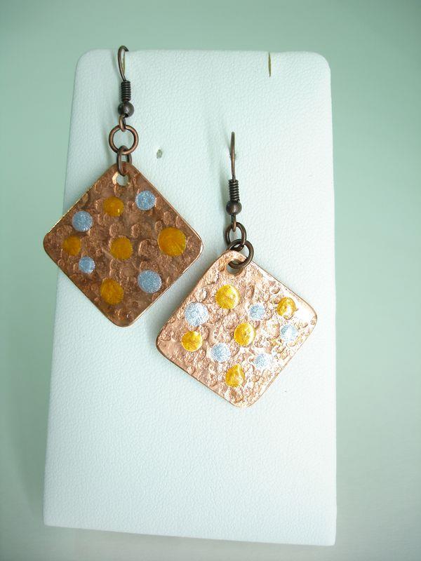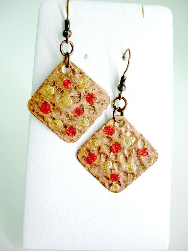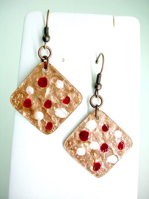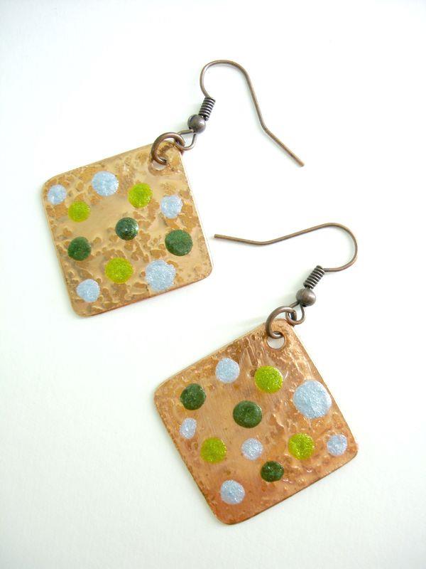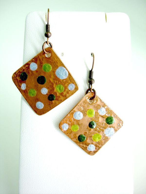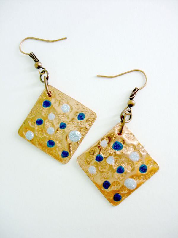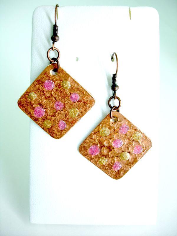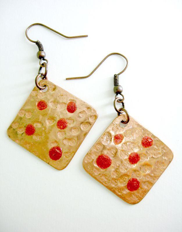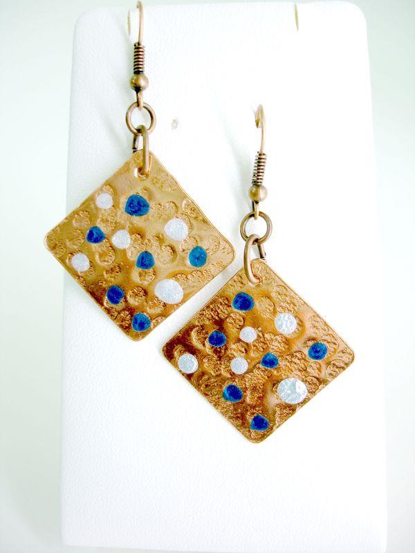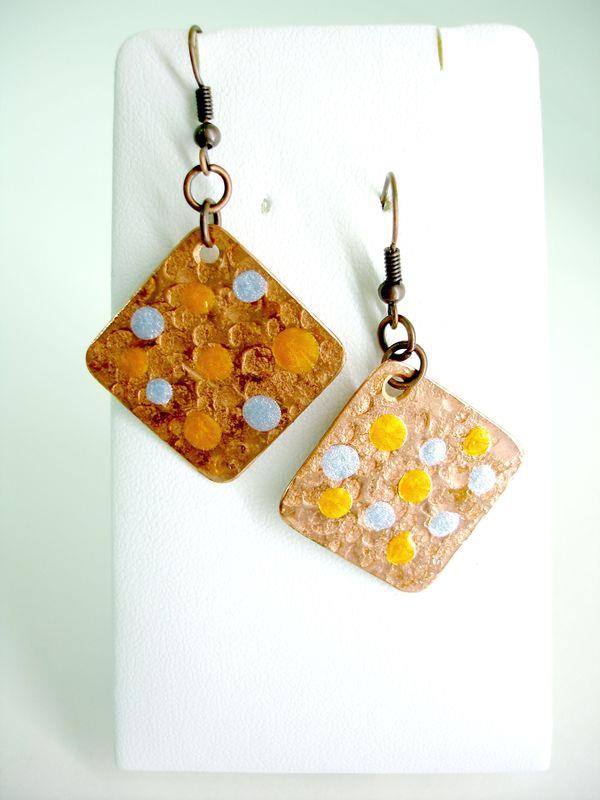 Orecchini pendenti in rame forma quadrato, martellato, smaltato, imbrunito e lucidato. Misura cm 2,2 x 2,2 con monachelle in rame, pezzi unici irripetibili. Il metallo essendo martellato sviluppa dei giochi di luce ed ombra, questo con la più piccola variazione di luce, illumina il viso. Ogni manufatto viene lavorato interamente a mano, il rame non si ossida rimane inalterato nel tempo.