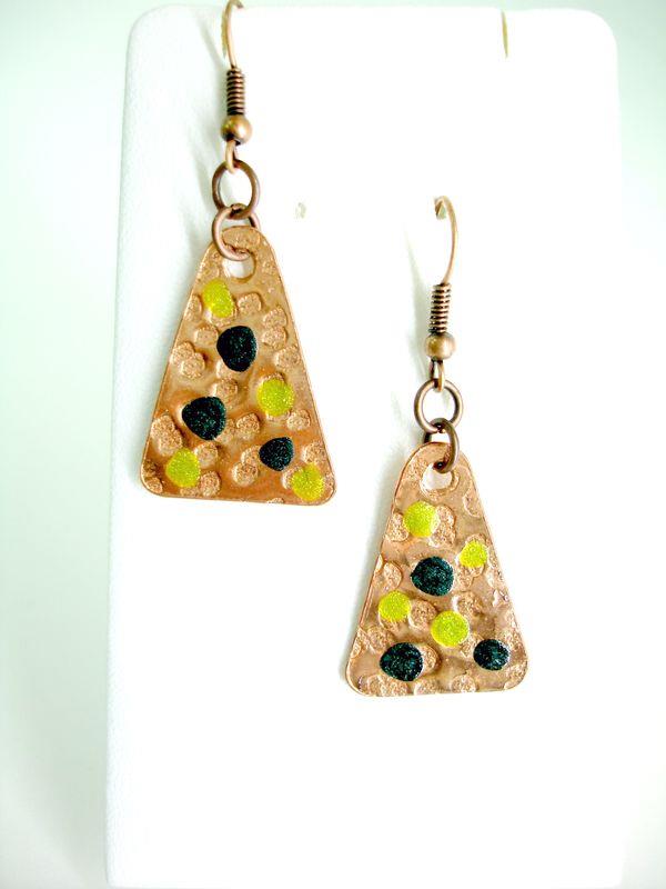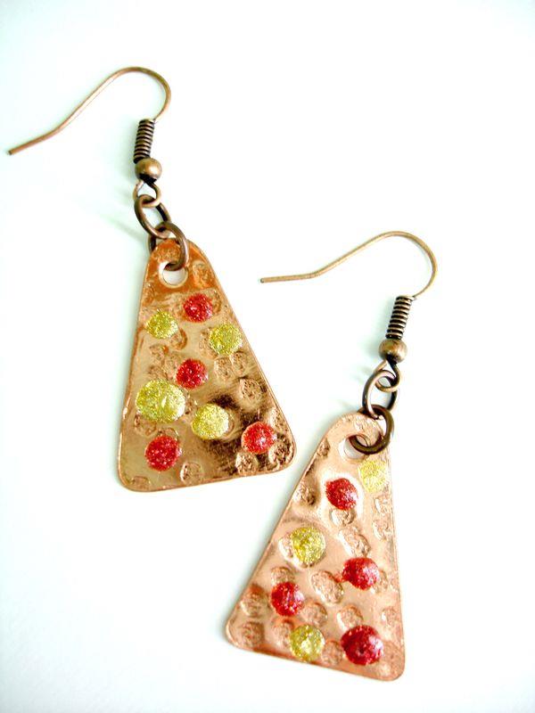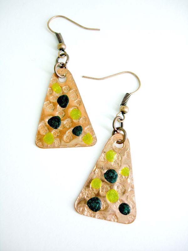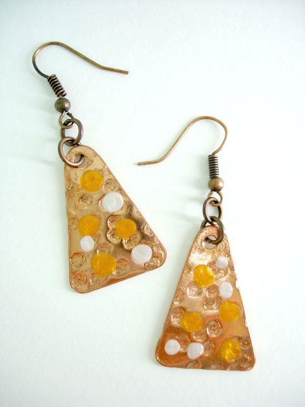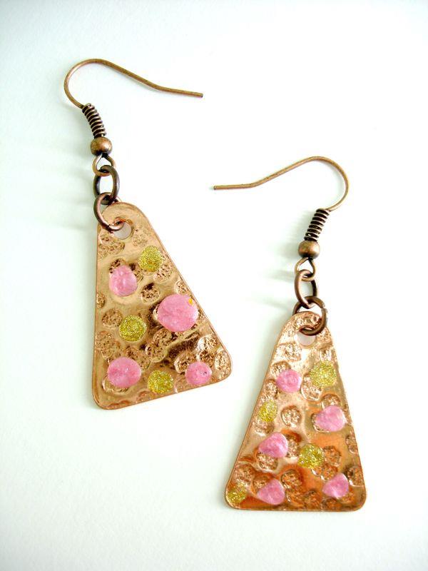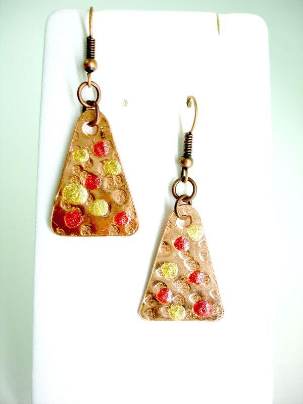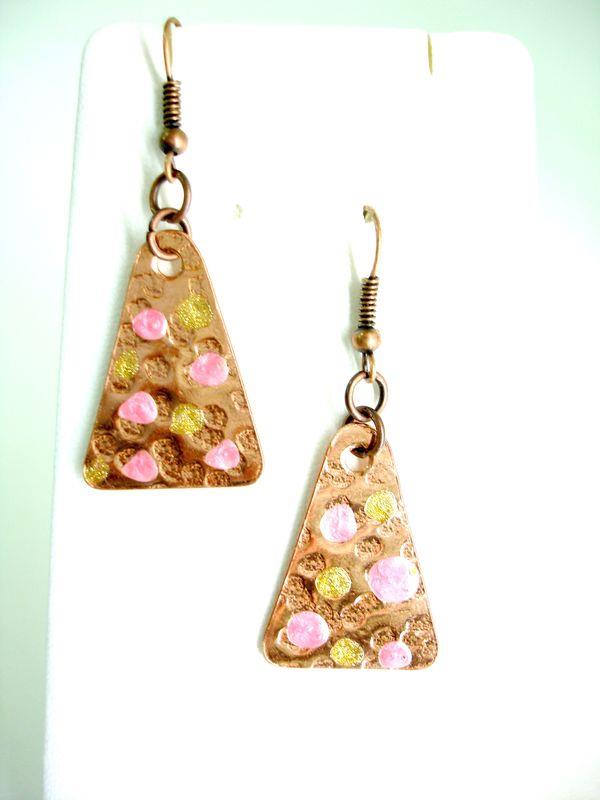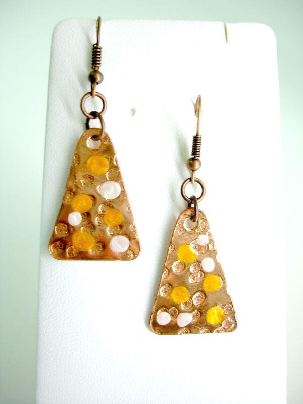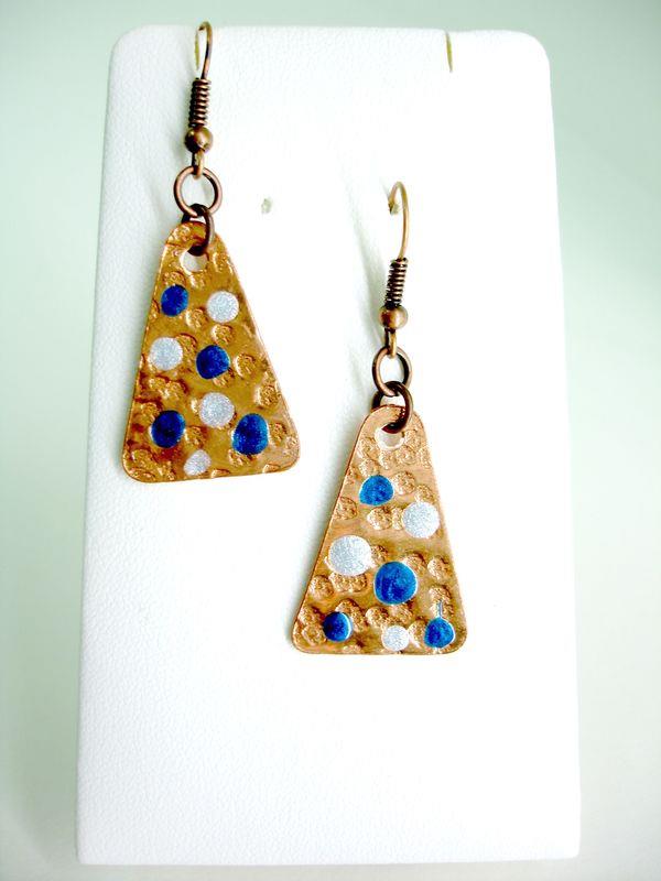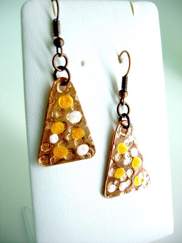Orecchini pendenti in rame forma triangolo, martellato, smaltato, imbrunito e lucidato. Misura cm 2 x 2,7 con monachelle in rame, pezzi unici irripetibili. Il metallo essendo martellato sviluppa dei giochi di luce ed ombra, questo con la più piccola variazione di luce, illumina il viso. Ogni manufatto viene lavorato interamente a mano, il rame non si ossida rimane inalterato nel tempo.
