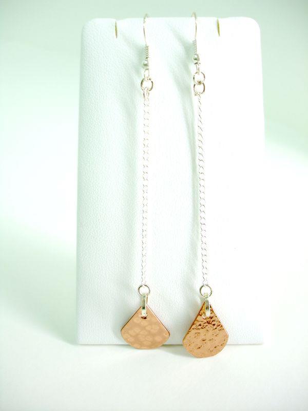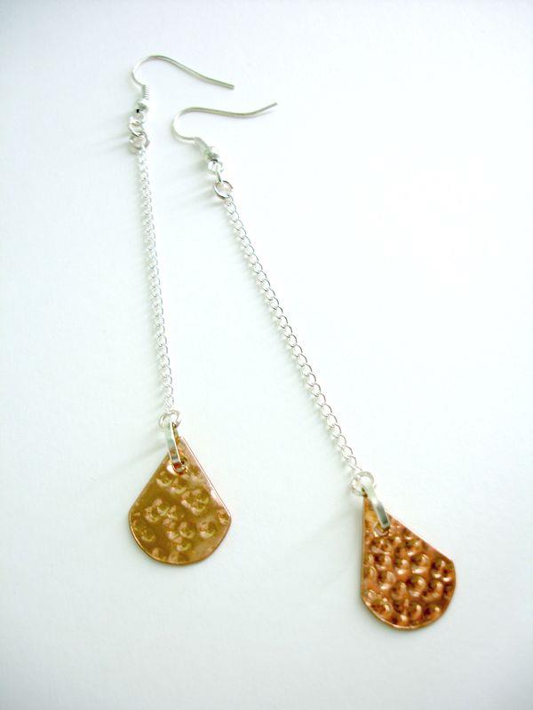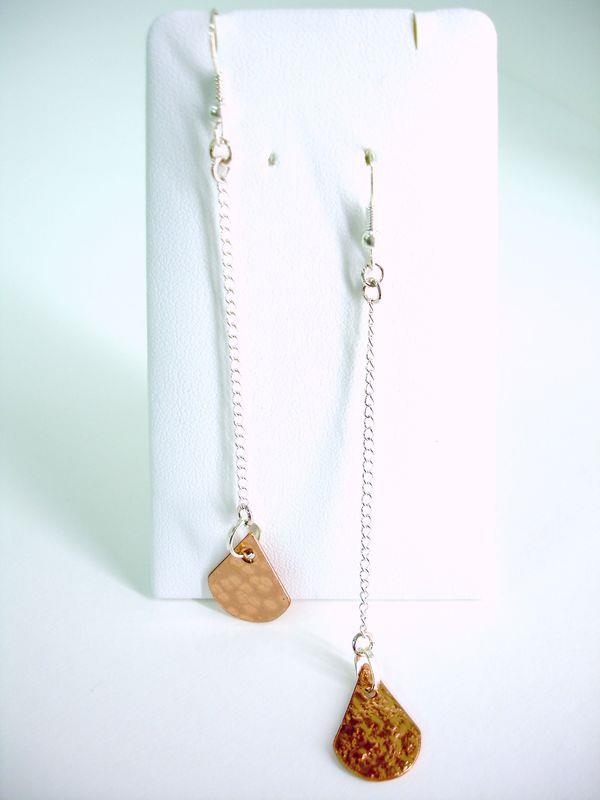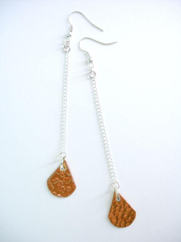 Orecchini pendenti in rame forma goccia piccoli,martellato, imbrunito e lucidato. Misura cm 1 x 8 con catena e monachelle silver, sono pezzi unici irripetibili. Il metallo essendo martellato sviluppa dei giochi di luce ed ombra, questo con la più piccola variazione di luce, illumina il viso. Ogni manufatto viene lavorato interamente a mano, il rame non si ossida rimane inalterato nel tempo.