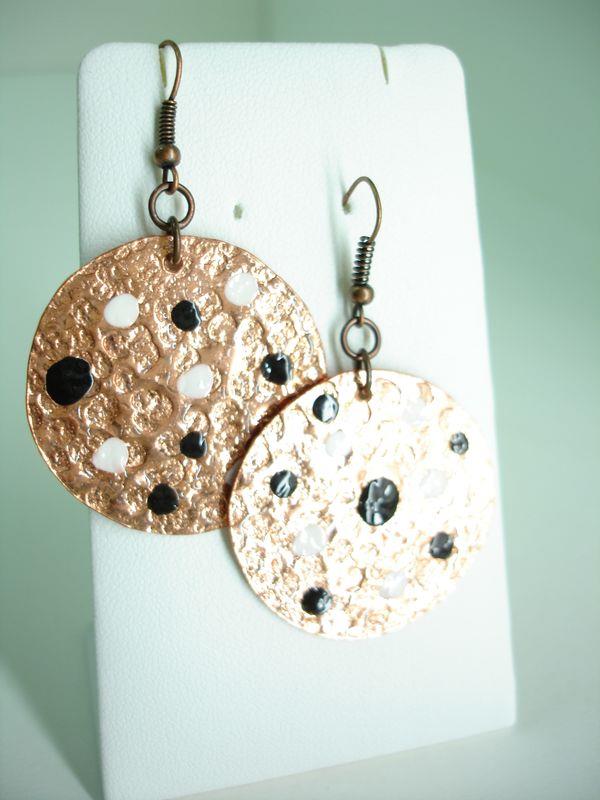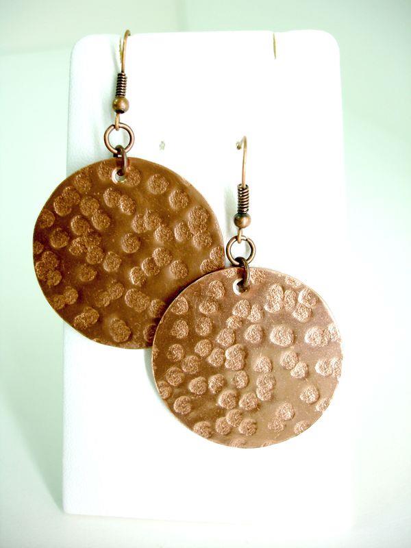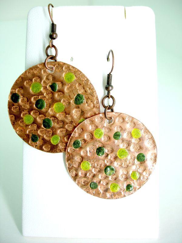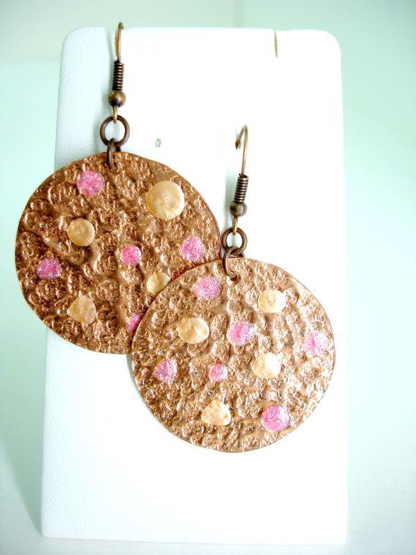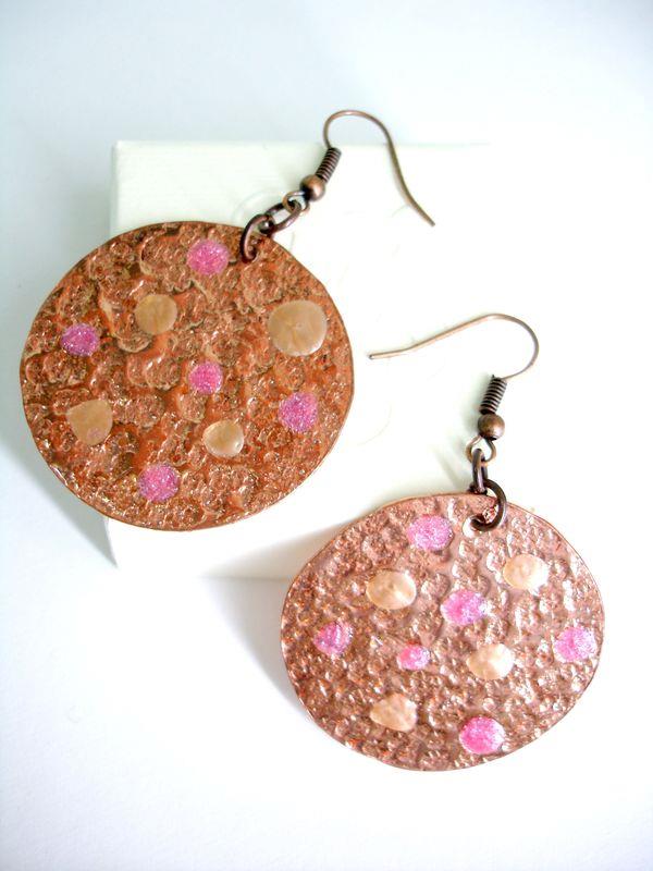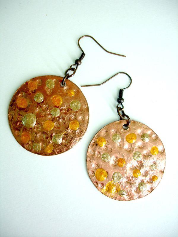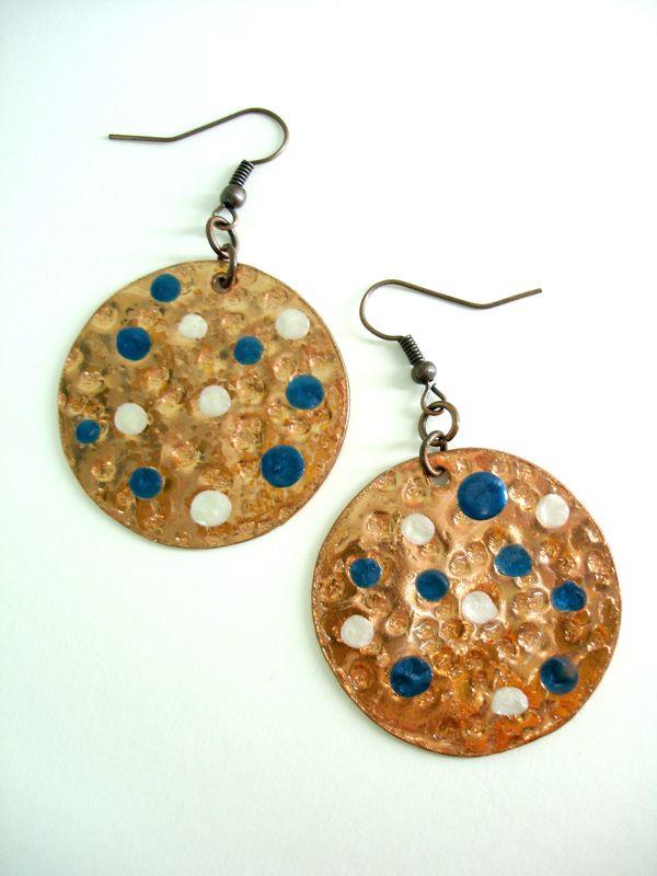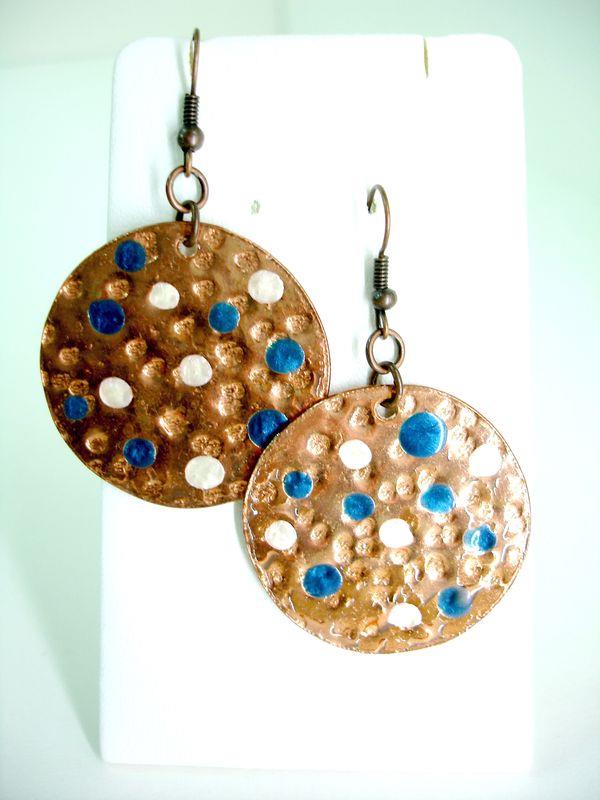 Orecchini pendenti in rame forma cerchio grande, martellati, imbruniti, smaltati e lucidi lucidi. Misura diametro cm 3,5 con monachelle in rame, sono pezzi unici irripetibili. Il metallo essendo martellato sviluppa dei giochi di luce ed ombra, questo con la più piccola variazione di luce, illumina il viso. Ogni manufatto viene lavorato interamente a mano, il rame non si ossida rimane inalterato nel tempo.