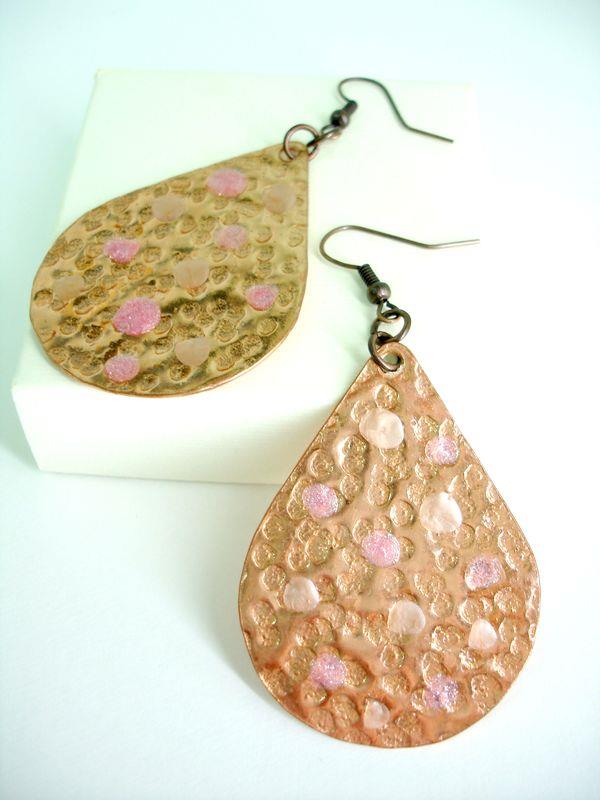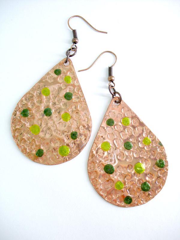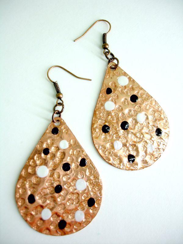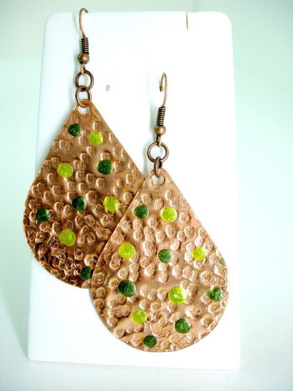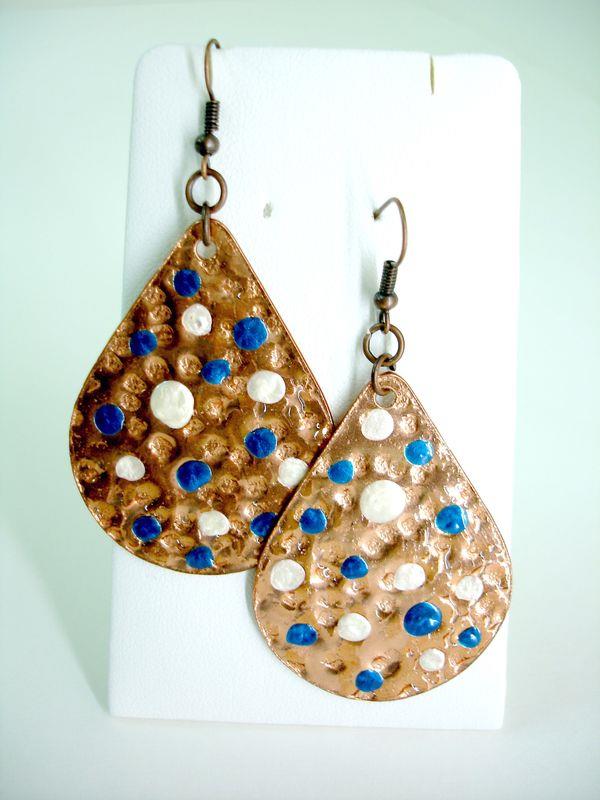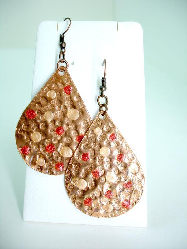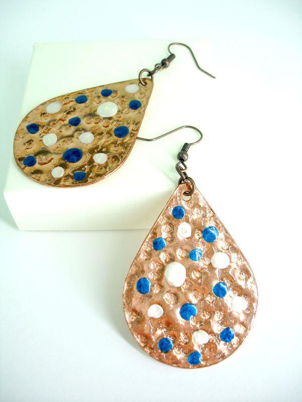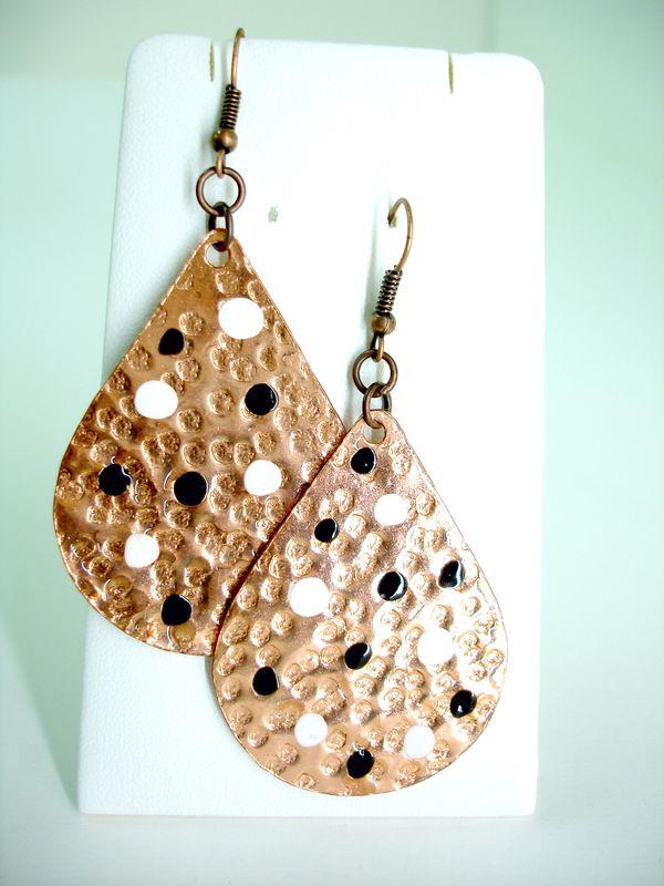 Orecchini pendenti in rame forma goccia grande, martellati, imbruniti, smaltati e lucidi. Misura cm 3,5 x 5 con monachelle in rame, sono pezzi unici irripetibili. Il metallo essendo martellato sviluppa dei giochi di luce ed ombra, questo con la più piccola variazione di luce, illumina il viso. Ogni manufatto viene lavorato interamente a mano, il rame non si ossida rimane inalterato nel tempo.