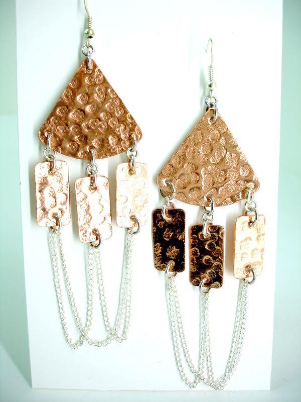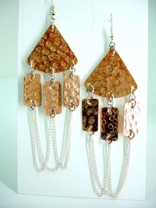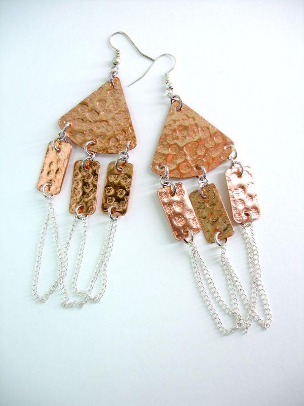 Orecchini pendenti in rame Cleopatra, martellati e lucidi. Misura cm 3,5 x 12 con monachelle, anelli e catenella in silver, sono pezzi unici irripetibili. Il metallo essendo sia martellato sviluppa dei giochi di luce ed ombra, questo con la più piccola variazione di luce, illumina il viso. Orecchino importante, armonioso e morbido, si rende particolare per il gioco di movimento. Ogni manufatto viene lavorato interamente a mano, il rame non si ossida rimane inalterato nel tempo.