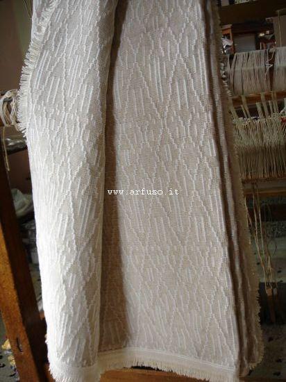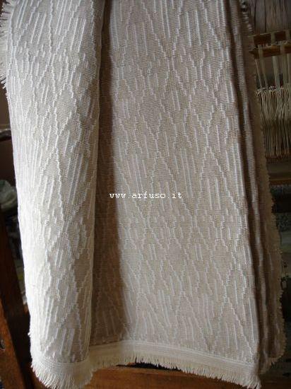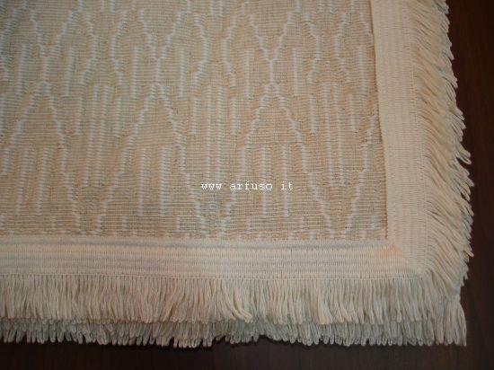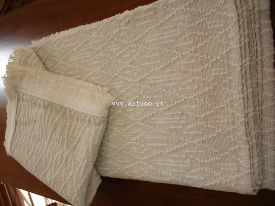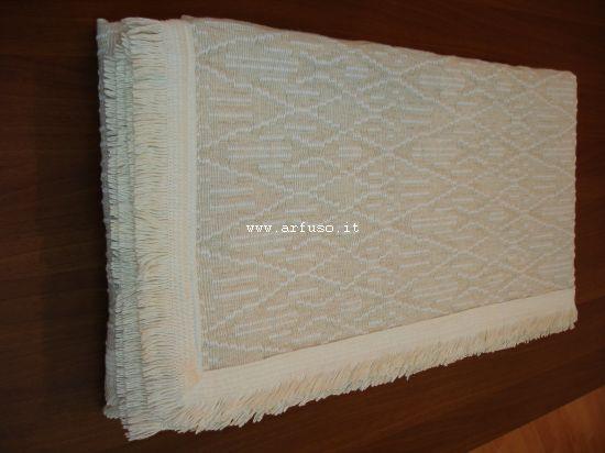 Caratteristiche: Tessuto, con motivi decorativi tradizionali della Magna Grecia, realizzato in, trama cotone sbiancato, ordito cotone naturale, colore avorio. Rifinito con frangia in filo perlato, tessuto molto resistente, misure ampie.