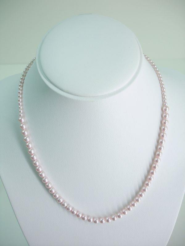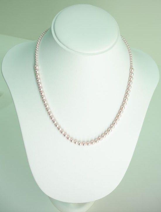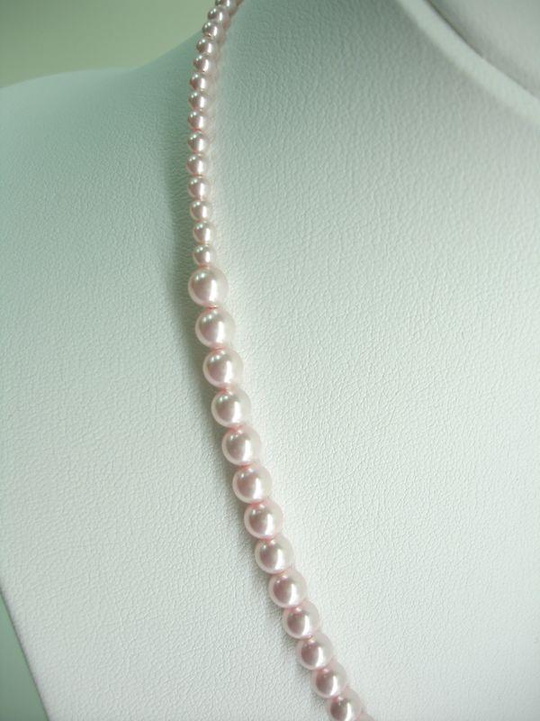 Collana di perle Swarovski Elementis di mm 6, agli estremi per otto cm movimentiamo la collana con perle di mm 4 e chiusura in argento. Lunghezza cm .