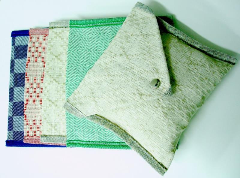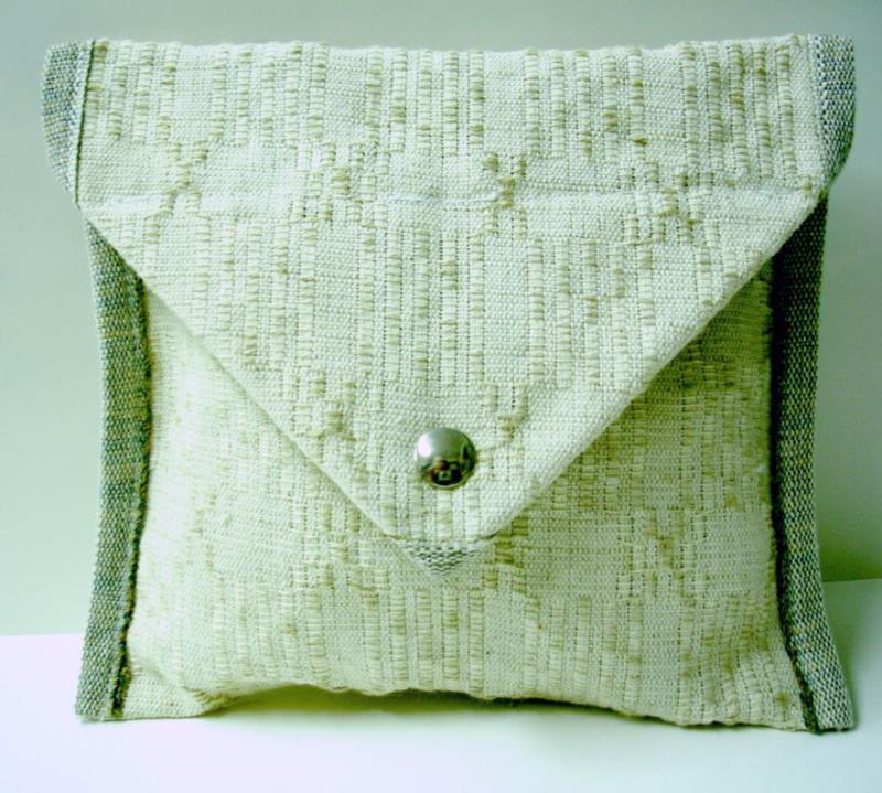 Caratteristiche:porta tovagliolo e porta posate con bottone. Tessuto con motivi decorativi tradizionali " la mattonella ", della Magna Grecia, realizzato in lino. Tessuto molto resistente, misura cm  20 x 18.