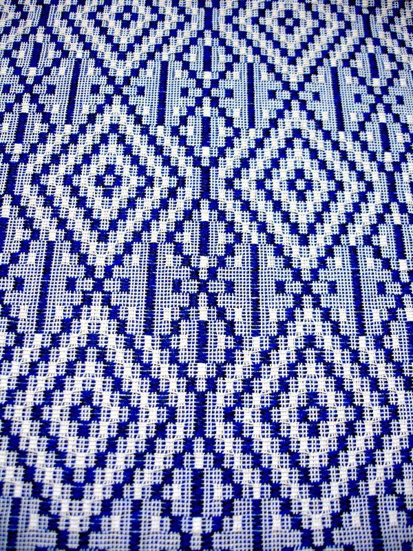 Guida da tavolo e runner di colore blu, disponibile in tutte le misure. Tessuto sfrangiato molto resistente, con motivo decorativo a rombi risalente alla Magna Grecia, lavabile in lavatrice a 60°.