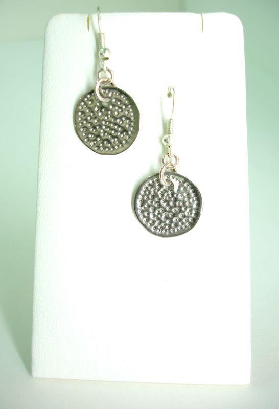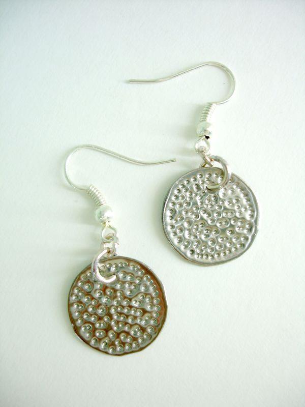 Orecchini soldo in acciaio aisi 316 anallergico e inossidabile, viene martellato e tagliato e lucidato a specchio, con motivo decorativo risalente alla Magna Grecia. Monachella e anellini in silver, semplice ed elegante, con il più piccolo movimento si crea un gioco di luce illuminando il viso.