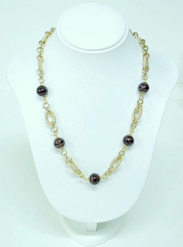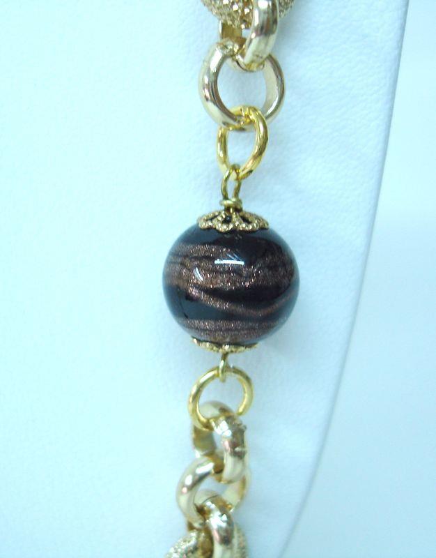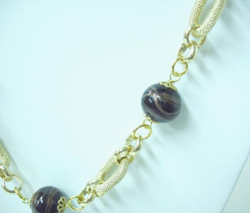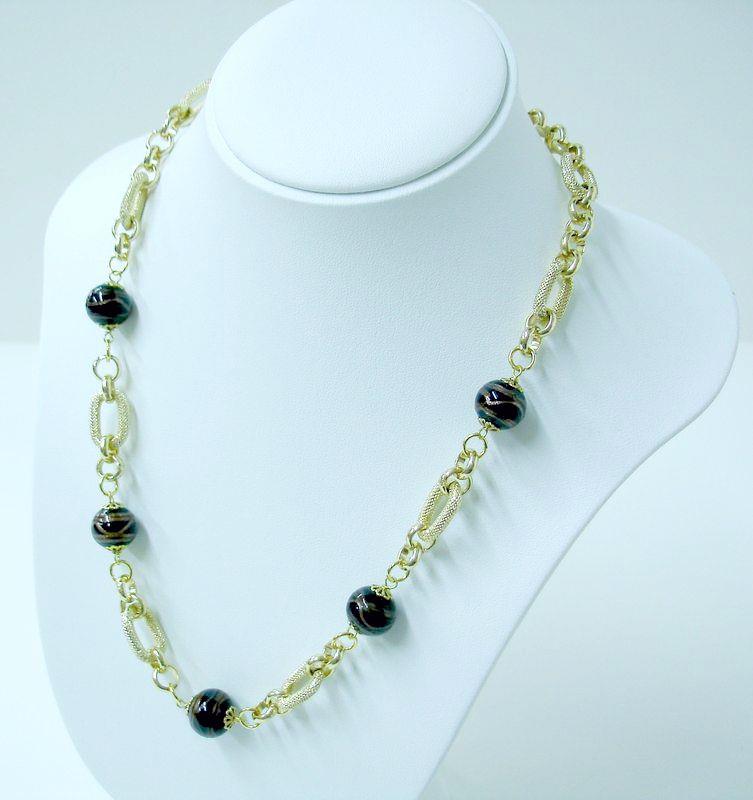 Collana in perle nere di porcellana con oro,  metallo inossidabile di colore oro e lavorato in filograna. Ogni perla è unica in quanto l'oro viene inserito avvolgendo la perla con movimento irregolare. Il collana si presenta molto elegante ed armoniosa, con gioco d'oro ineguagliabile e irripetibili.