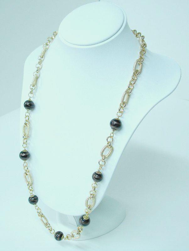 Collana in perle nere di porcellana con oro,  metallo inossidabile di colore oro e lavorato in filograna. Ogni perla è unica in quanto l'oro viene inserito avvolgendo la perla con movimento circolare. Il collana si presenta molto elegante ed armoniosa, con gioco d'oro ineguagliabile e irripetibili.
