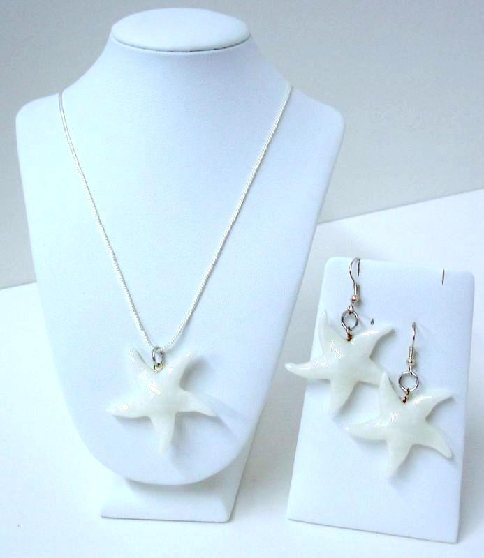 Orecchini e collana sono in porcellana soffiata stella marina con metallo in silver e laccio della collana in seta. La porcellana è leggerissima non si frange, ogni elemento è un pezzo unico sia per colore che per forma. Ogni manufatto viene lavorato interamente a mano.