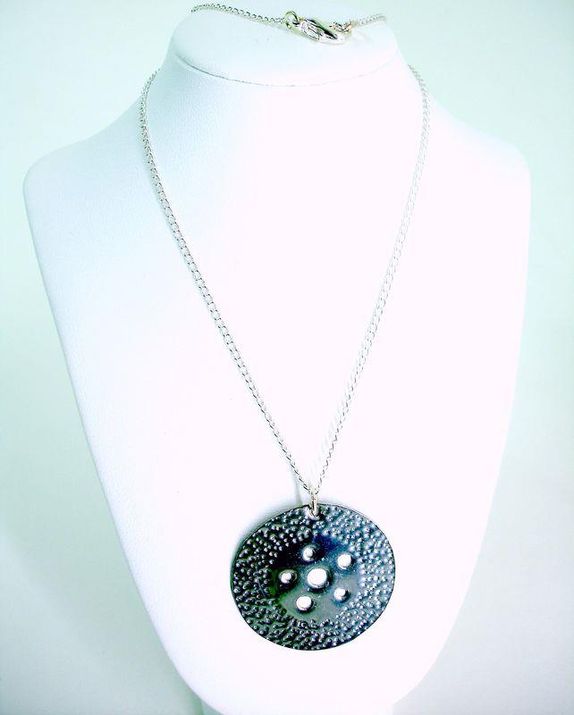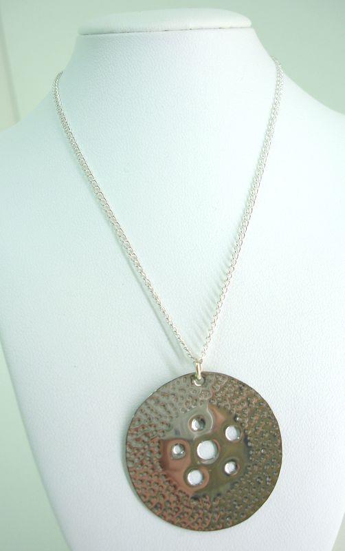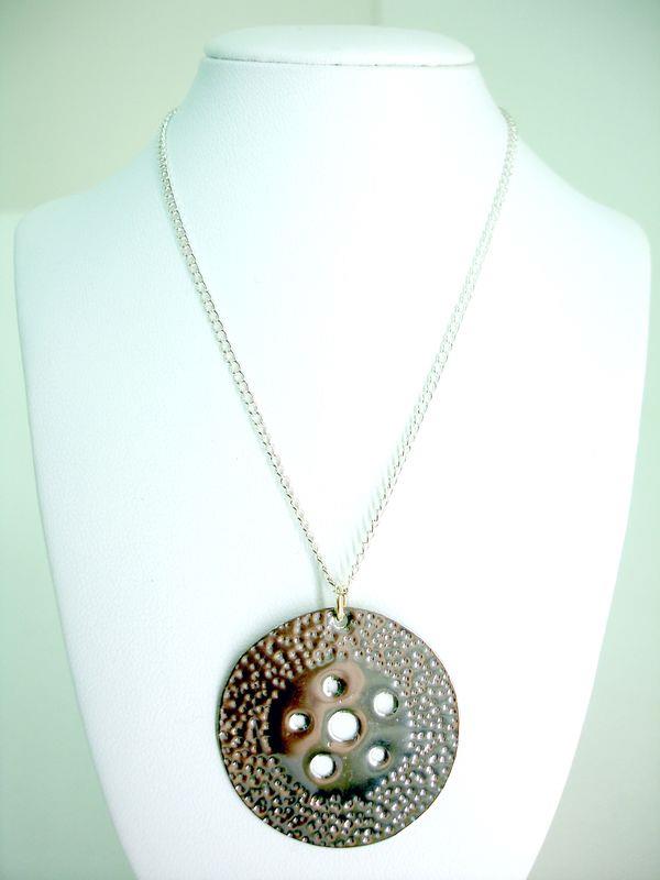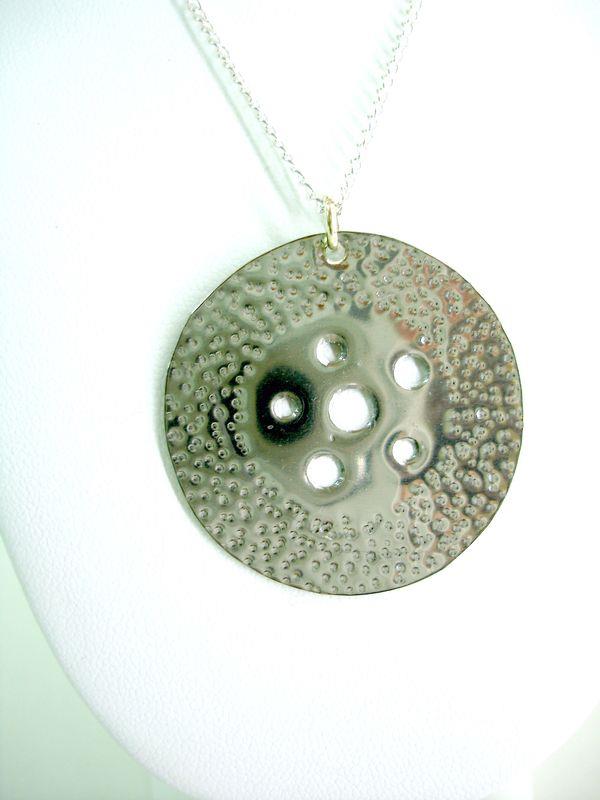 Collana pianeti in acciaio aisi 316 anallergico e inossidabile, viene martellato, forato, tagliato e lucidato a specchio, con motivo decorativo risalente alla Magna Grecia. Catena e anellini in silver, molto elegante ed avvolgente, con il più piccolo movimento si crea un gioco di luce illuminando il viso. Catena lunga cm 42