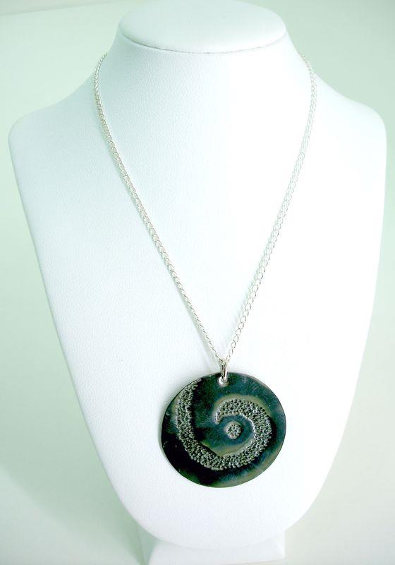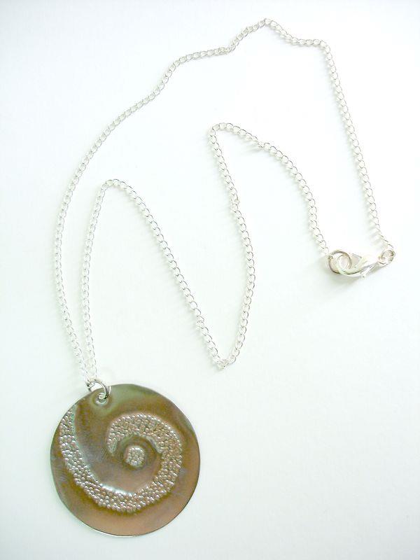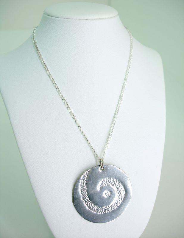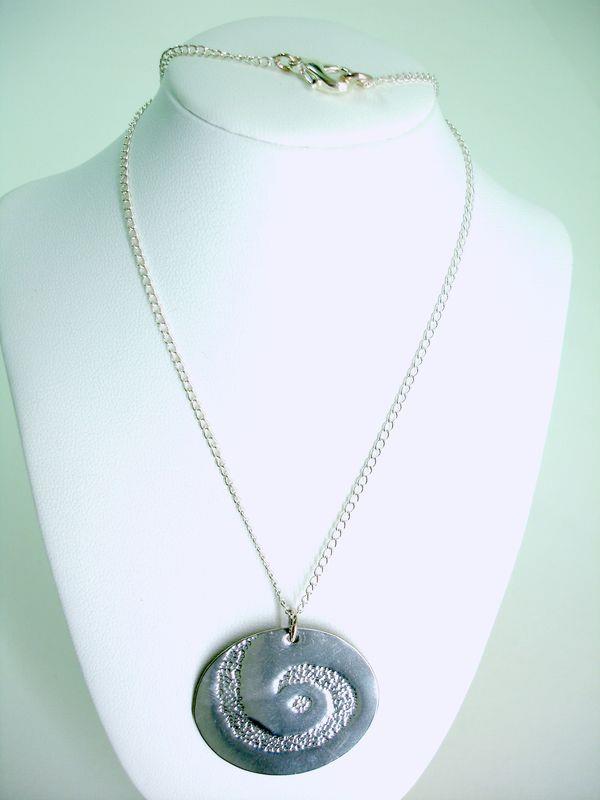 Collana vortice in acciaio aisi 316 anallergico e inossidabile, viene martellato, tagliato e lucidato a specchio, con motivo decorativo risalente alla Magna Grecia. Catena e anellini in silver, molto elegante ed avvolgente, catena lunga cm 42, con il più piccolo movimento si crea un gioco di luce rendendo tutto luminoso.