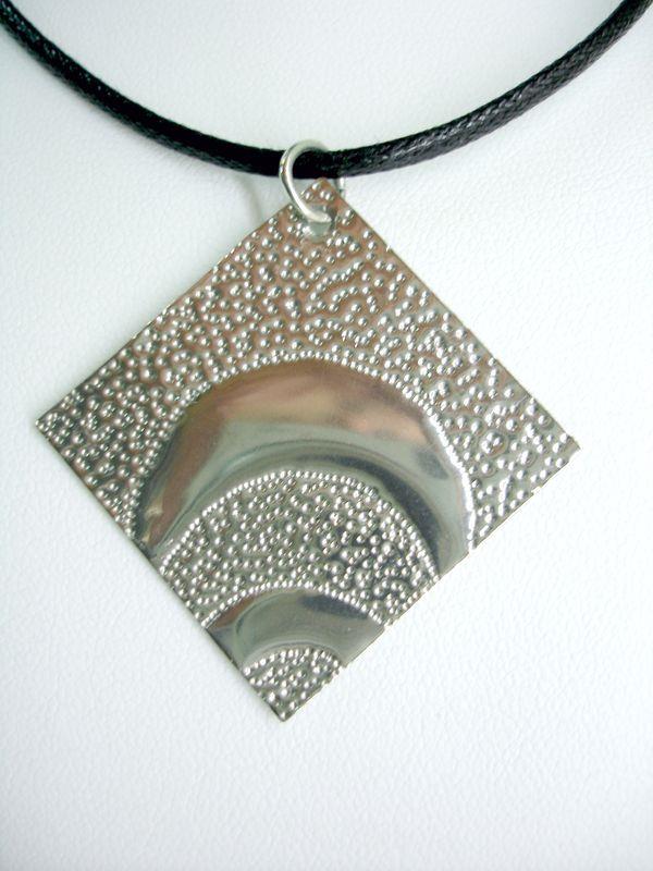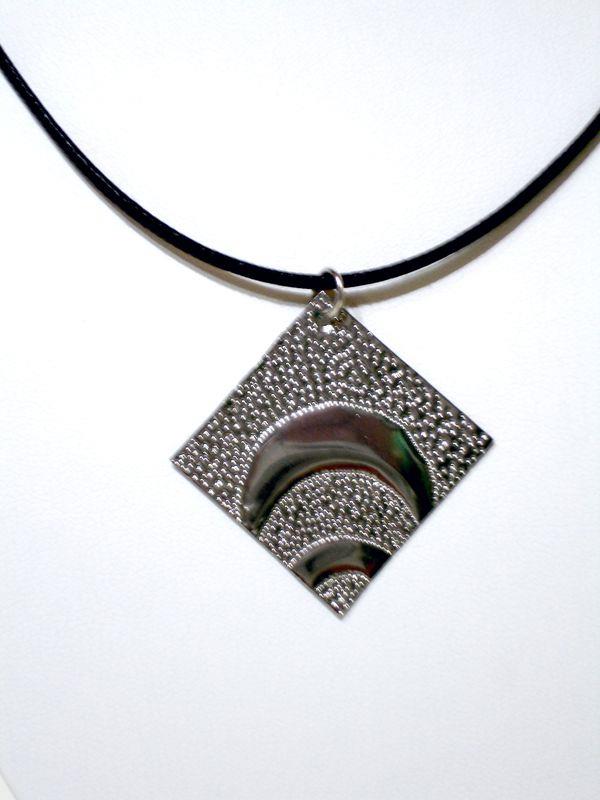 Collana arco in acciaio aisi 316 anallergico e inossidabile, viene martellato, tagliato e lucidato a specchio, con motivo decorativo risalente alla Magna Grecia. Laccio in cotone cerato e chiusura in silver, molto elegante e sportiva,  medaglione cm 3 x 3,  con il più piccolo movimento si crea un gioco di luce rendendo tutto luminoso.