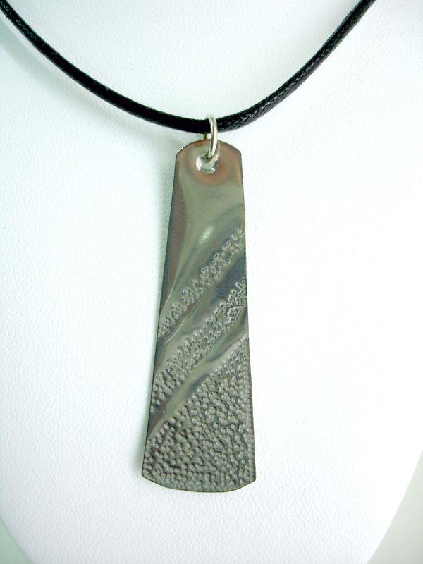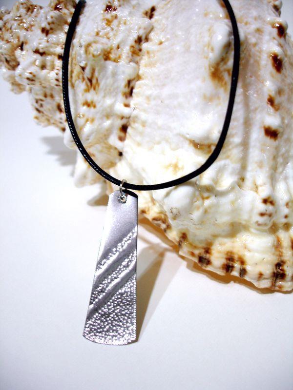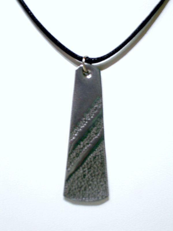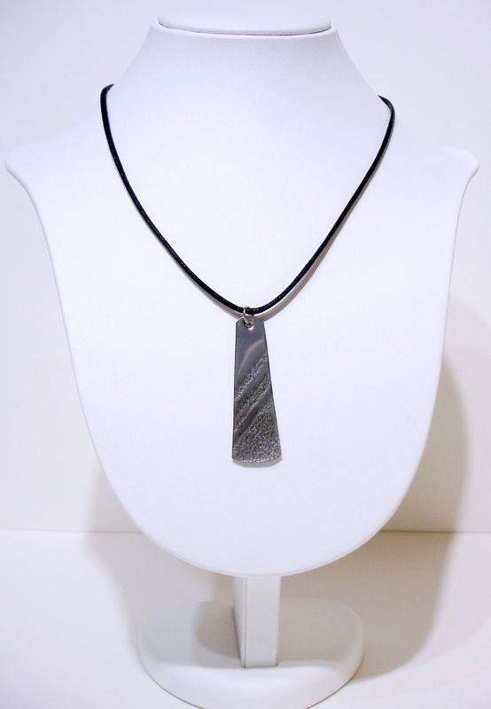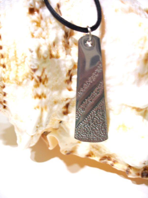 Collana fascino in acciaio aisi 316 anallergico e inossidabile, viene martellato, tagliato e lucidato a specchio, con motivo decorativo risalente alla Magna Grecia. Laccio in cotone cerato e chiusura in silver, molto elegante e sportiva,  medaglione cm 5 x 1,5,  con il più piccolo movimento si crea un gioco di luce rendendo tutto luminoso.