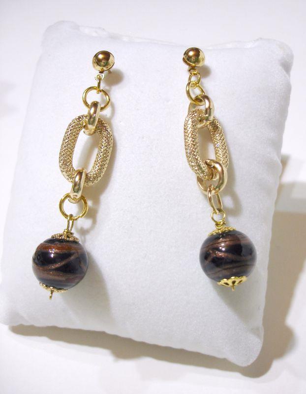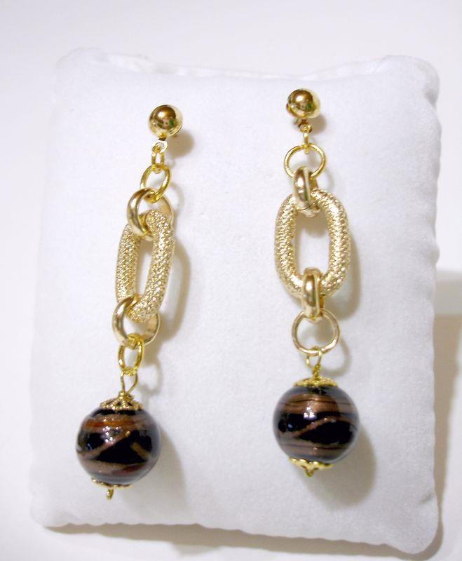 Orecchini in perle nere di porcellana con oro e filigrana, metallo anallergico e inossidabile di colore oro, lavorato in filigrana. Ogni perla è unica in quanto l'oro viene inserito avvolgendo la perla con movimento circolare. Gli orecchini si presentano molto eleganti e armoniosi, con gioco d'oro ineguagliabile e irripetibile. Diametro delle perle cm 1,4 orecchino lungo cm 6.