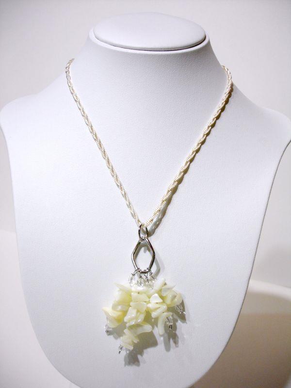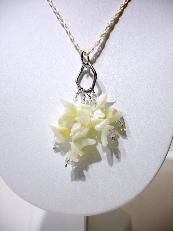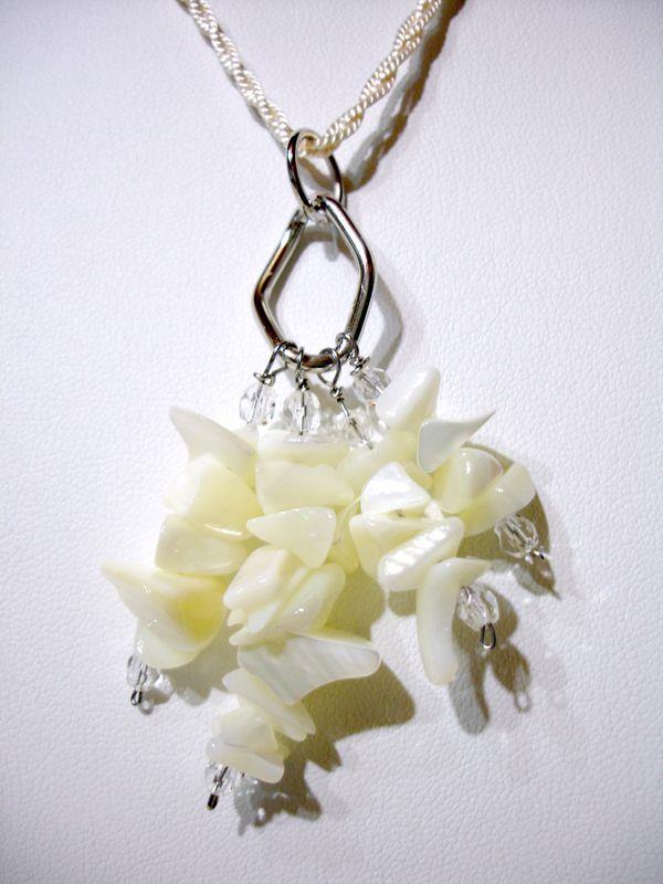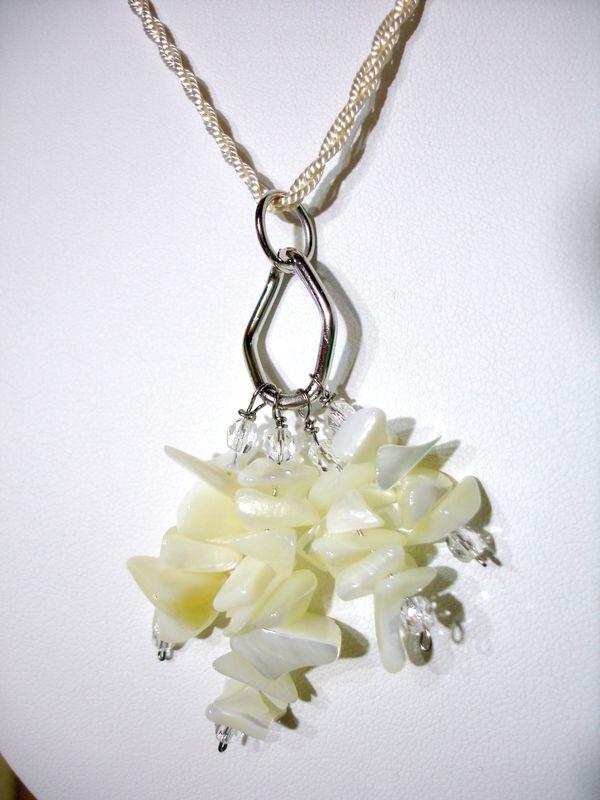Collana in madreperla e cristallo con laccio treccia in seta e chiusura in silver. Ogni elemento di madreperla è unico formato da steli, incorporando ad essi delle piccole perle di cristallo, concludendo con elementi in metallo silver, inossidabili e anallergici. La collana si presenta molto elegante ed armoniosa e piena di fascino, con gioco di luce ineguagliabile e irripetibile. Ciondolo lungo cm 7 ( da anellino).