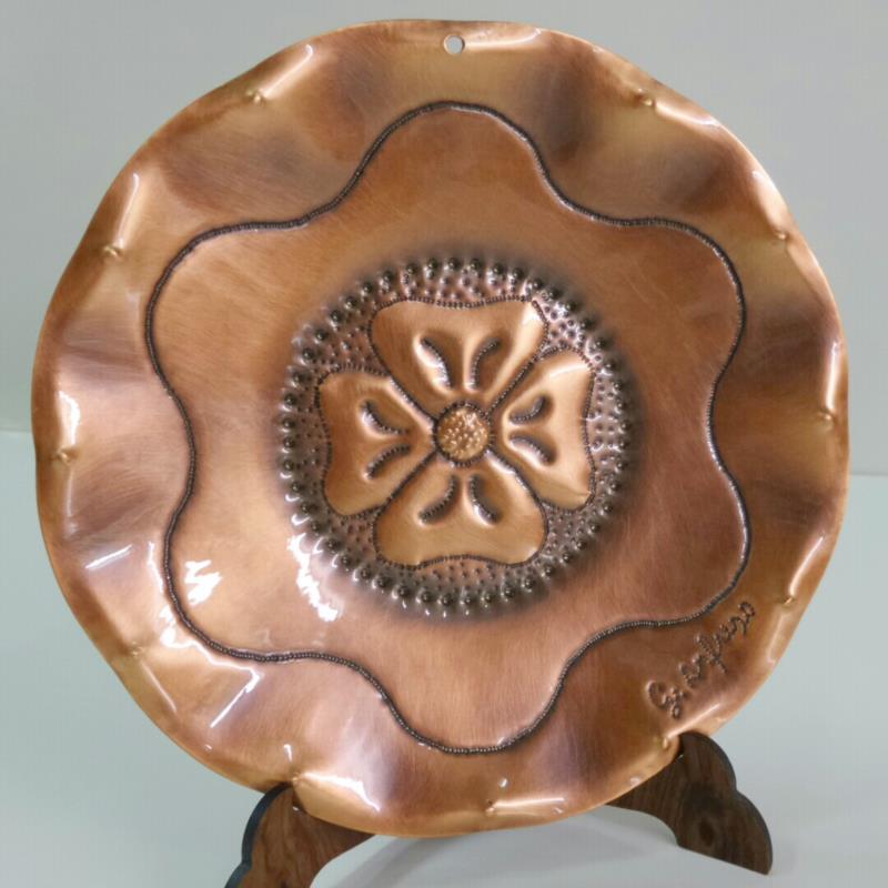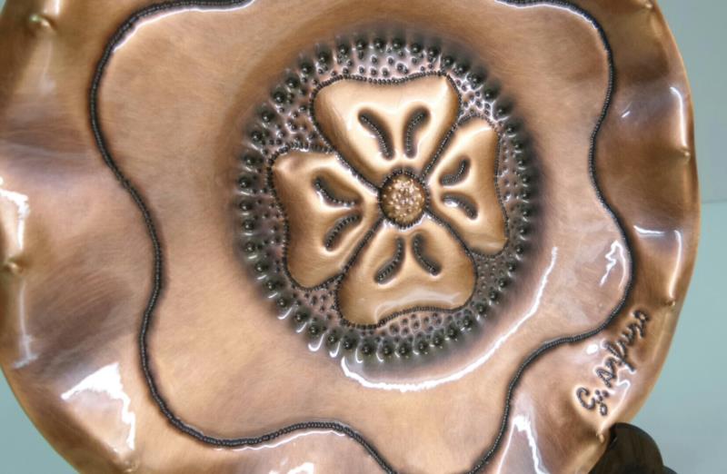 Spasetta e svuota tasche in rame, lavorato a mano con tecnica antichissima, internamente riprodotto il motivo del quadrifoglio, ingabbiato da onde a forma di fiore.  Elemento di porta fortuna e prosperità.
