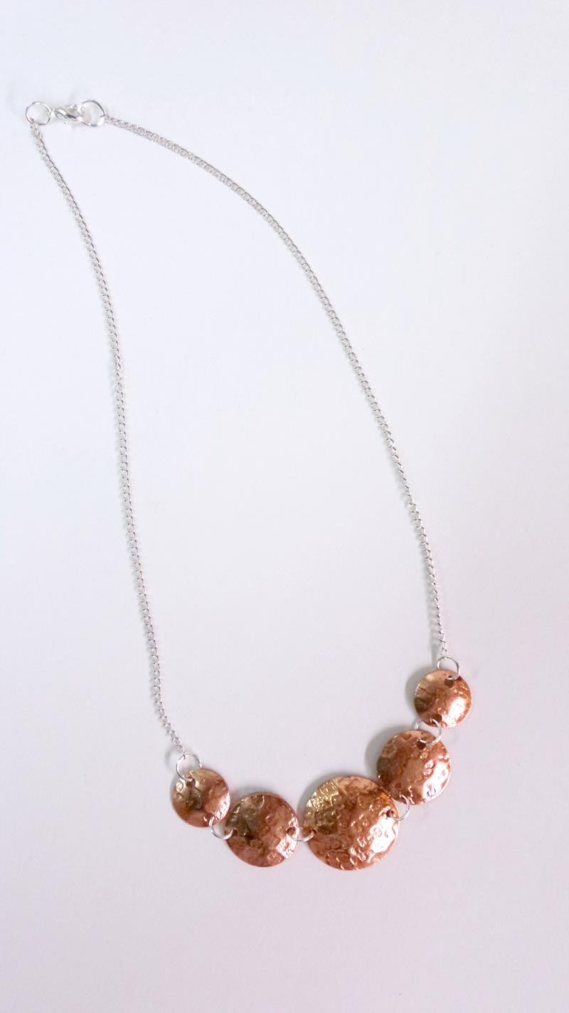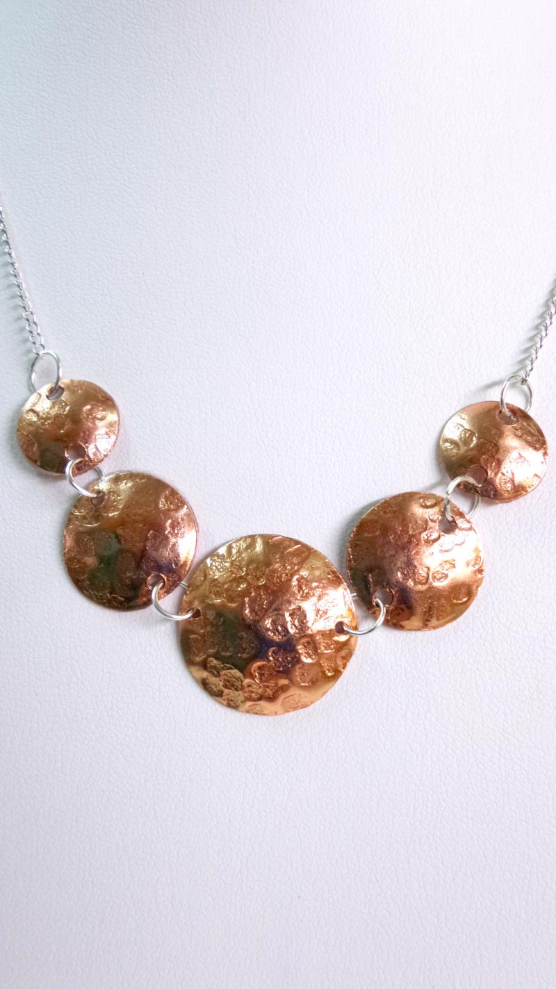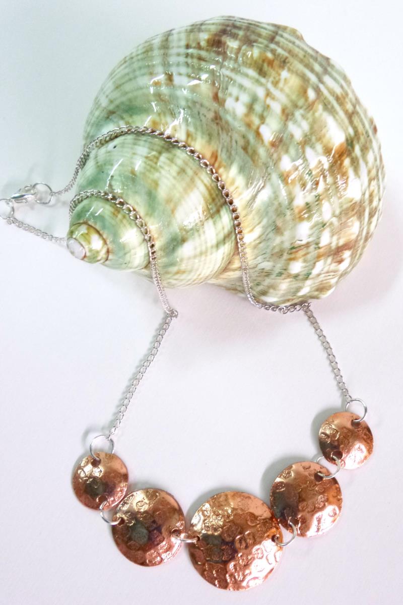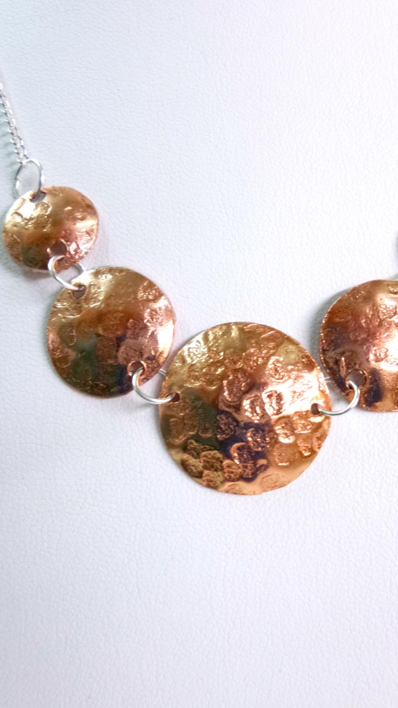 Collana - girocollo in rame e silver. Eseguito interamente a mano, i metalli rimangono inalterati nel tempo. Lavorazione a rialzo tramite lo sbalzo e la martellatura. Ritmo  armonioso con un tocco di eleganza e di fascino anche se si rende facilmente indossabile.