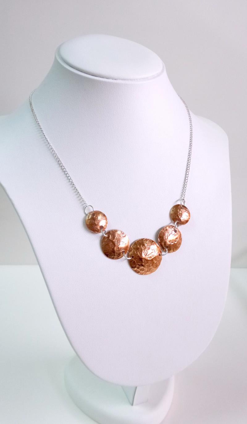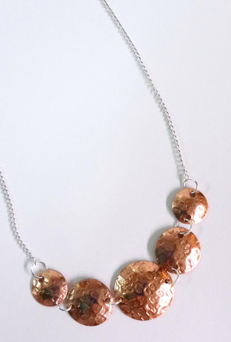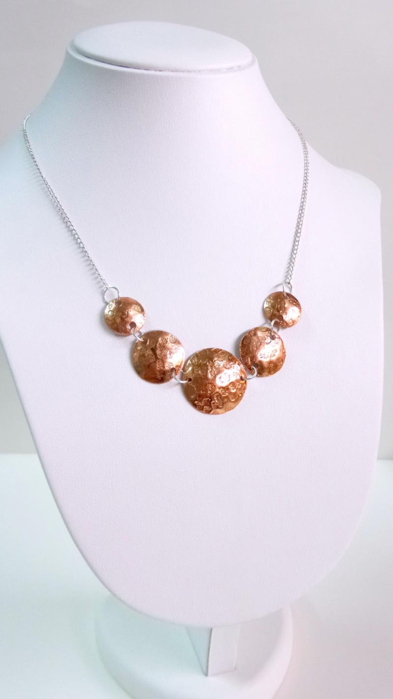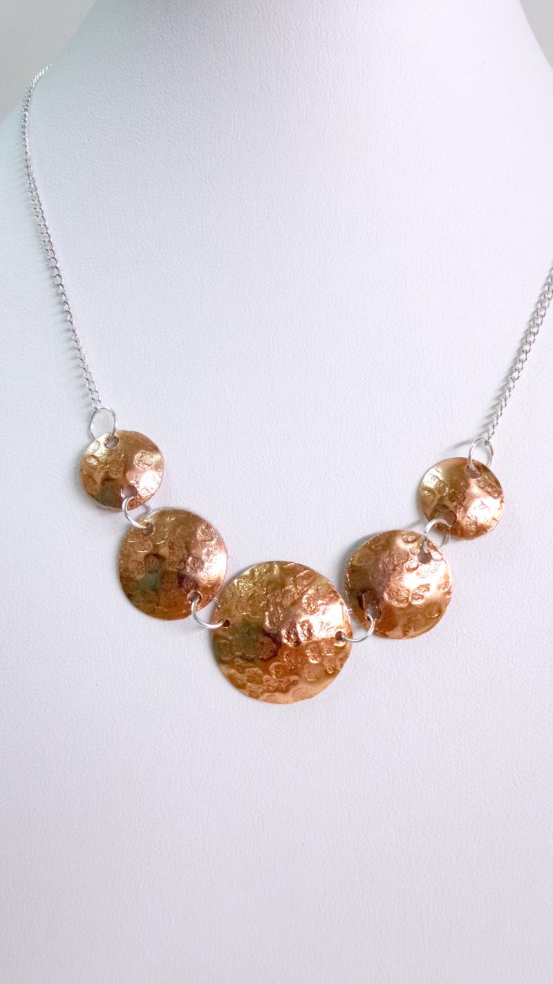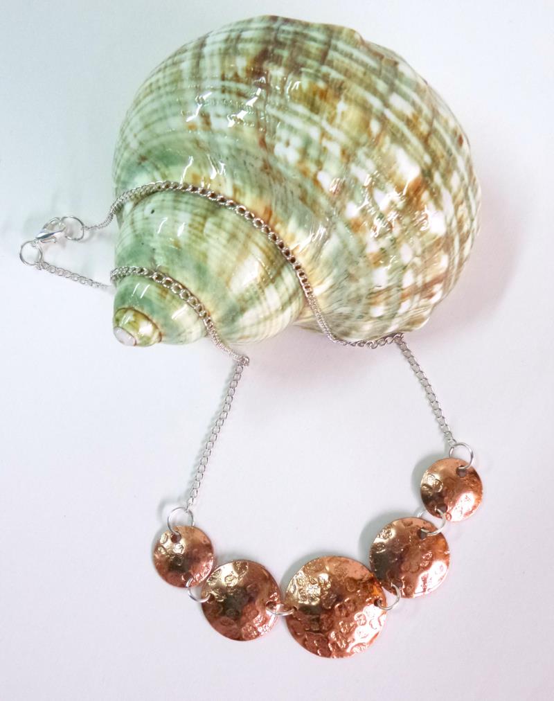 Collana - girocollo in rame e silver. Eseguito interamente a mano, i metalli rimangono inalterati nel tempo. Lavorazione a rialzo tramite lo sbalzo e la martellatura. Ritmo  armonioso con un tocco di eleganza e di fascino anche se si rende facilmente indossabile.