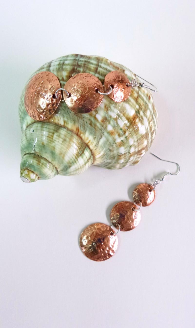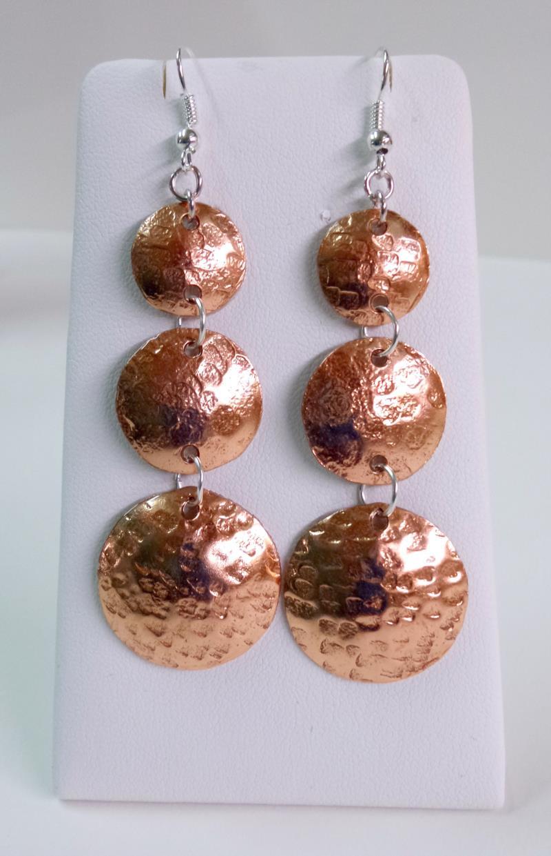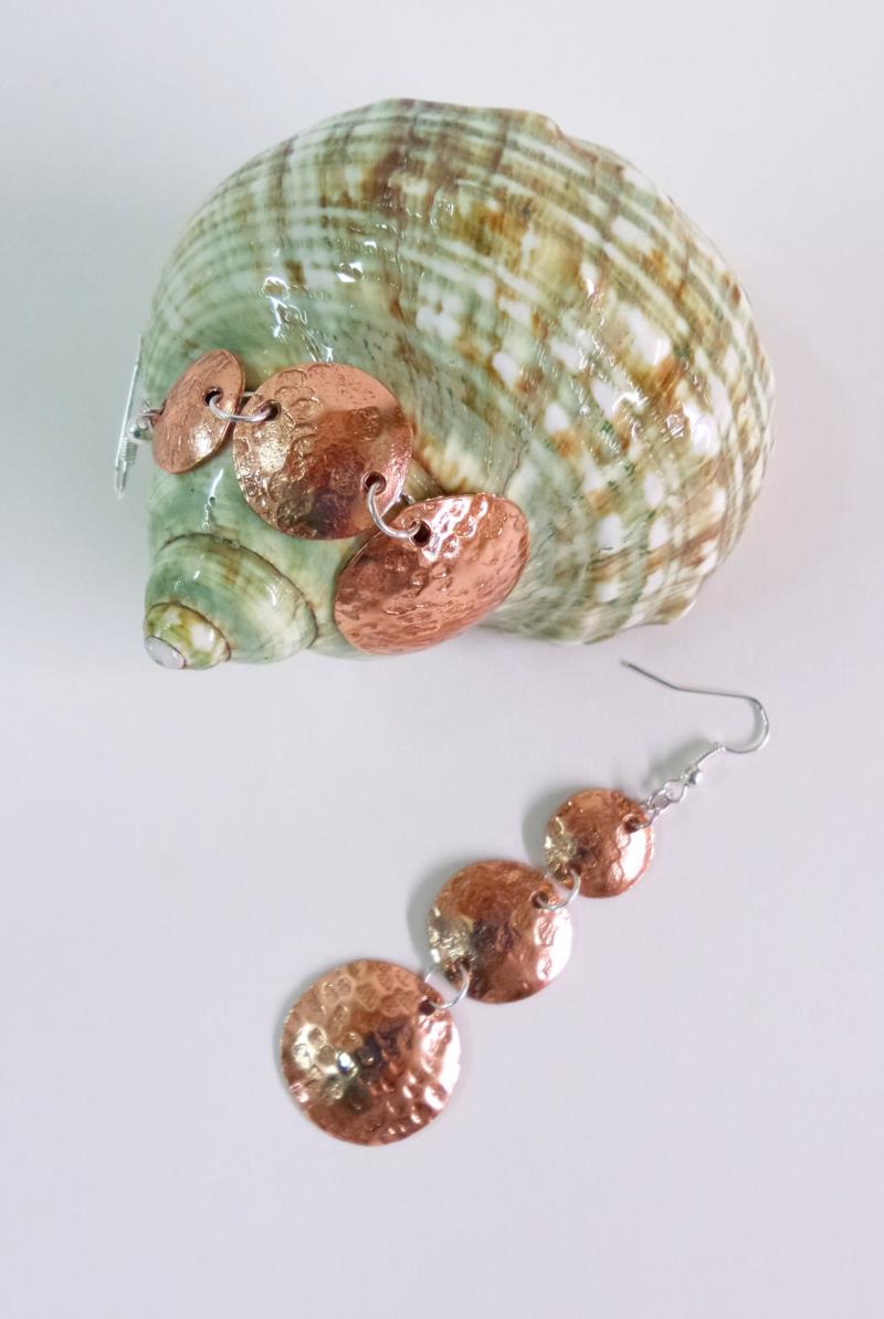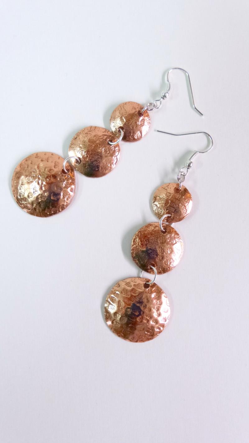 Orecchini pendenti in rame e silver, linea Mare. .Il rame e martellato e lucidato, con i suoi tre elementi uno più piccolo dell'altro, creano un effetto di prospettiva che va ad accentuare il gioco di luce che si sviluppa con la continuità delle rotondità, illuminando e dando armonia al viso. Ogni manufatto viene lavorato interamente a mano, il rame non si ossida rimane inalterato nel tempo, così anche il silver. Alta Qualità, Gioite.