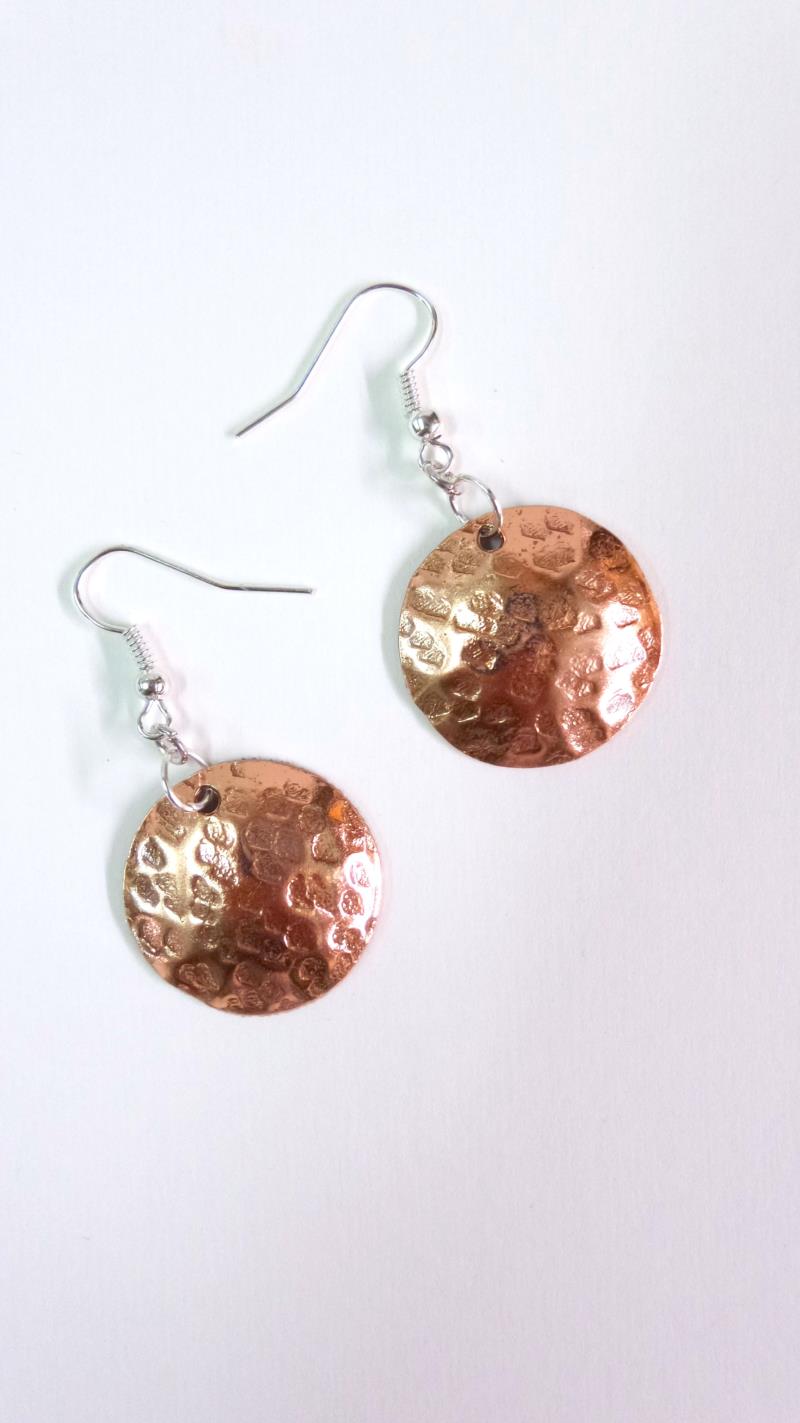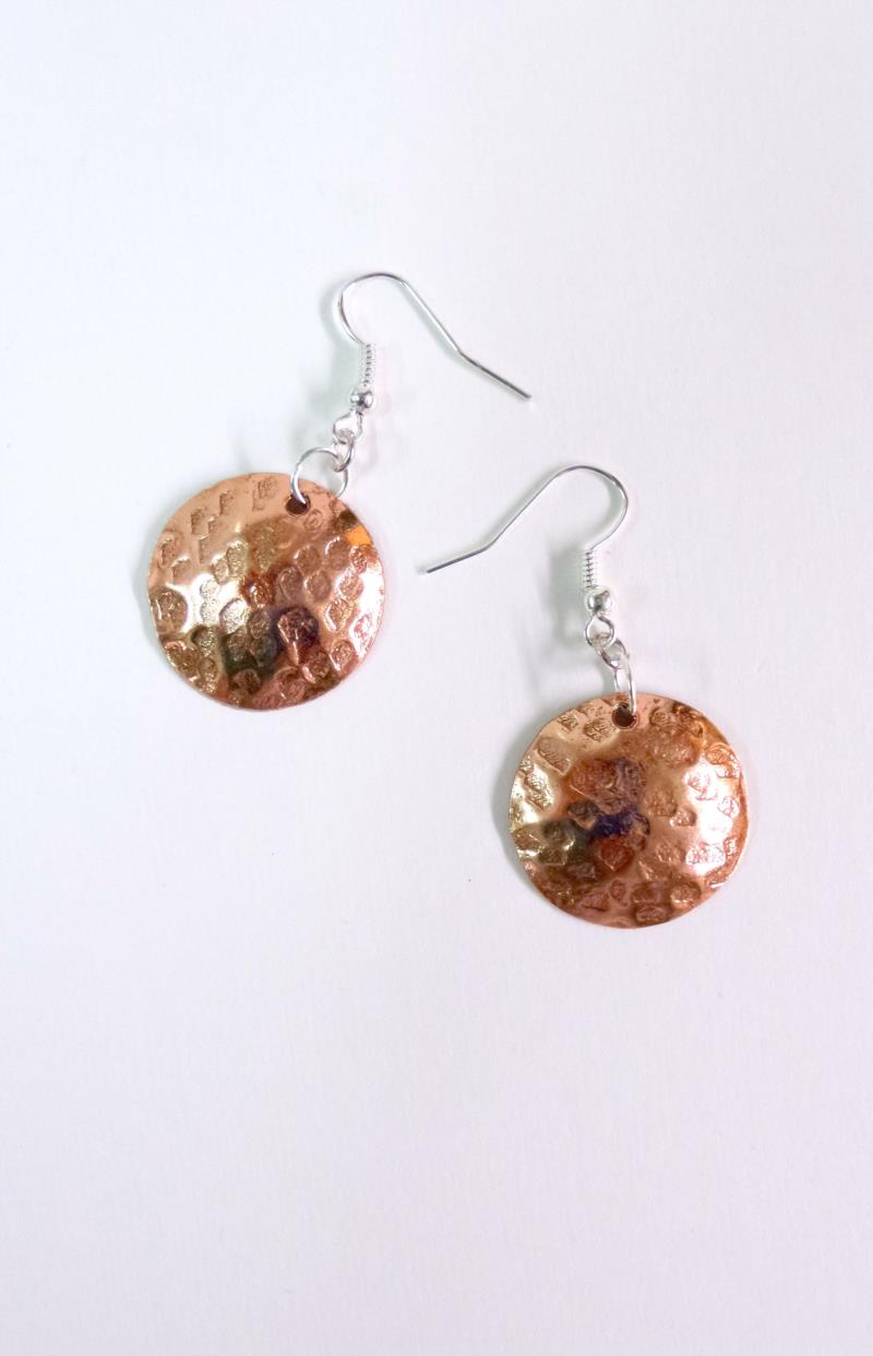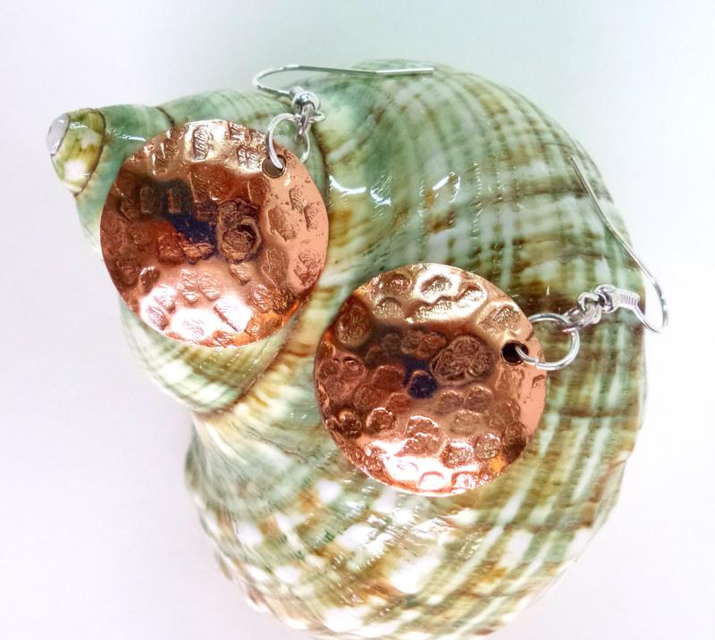 Orecchini in rame e silver, linea Mare. Il rame è martellato, tagliato e lucidato, attraverso questa lavorazione tonda e bombata,  sviluppa dei giochi di luce ed ombra,. Con la più piccola variazione di luce, illumina interamente il viso. Il metallo è leggerissimo. Ogni manufatto viene lavorato interamente a mano, il rame non si ossida rimane inalterato nel tempo, così anche il silver.I nostri articoli sono di alta qualità, garantiti dal marchio Gioite.
