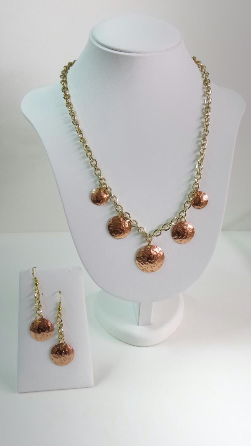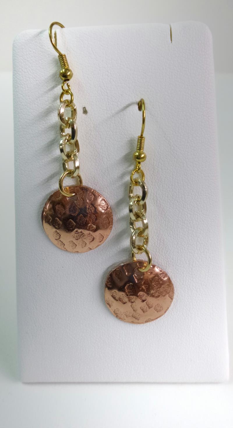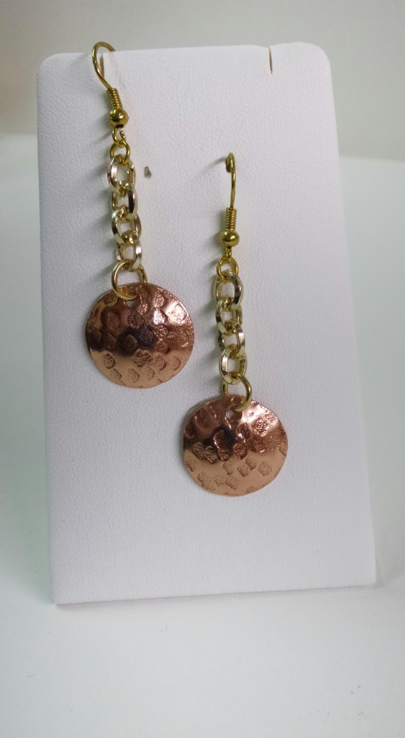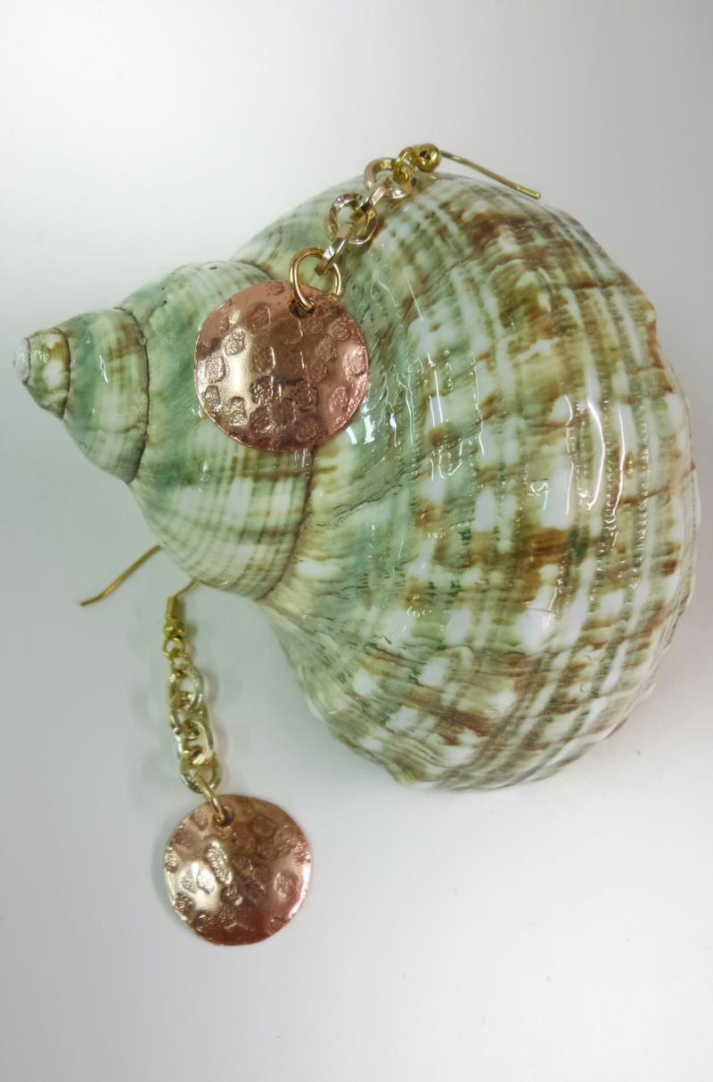Orecchini pendenti in rame a forma di cerchio concavo, martellato e sbaslzato, con catena  e monachella dorata, pezzi unici irripetibili. Il metallo essendo martellato sviluppa dei giochi di luce ed ombra, questo con la più piccola variazione, illumina il viso. Ogni manufatto viene lavorato interamente a mano. I metalli non si ossidano rimane inalterato nel tempo.