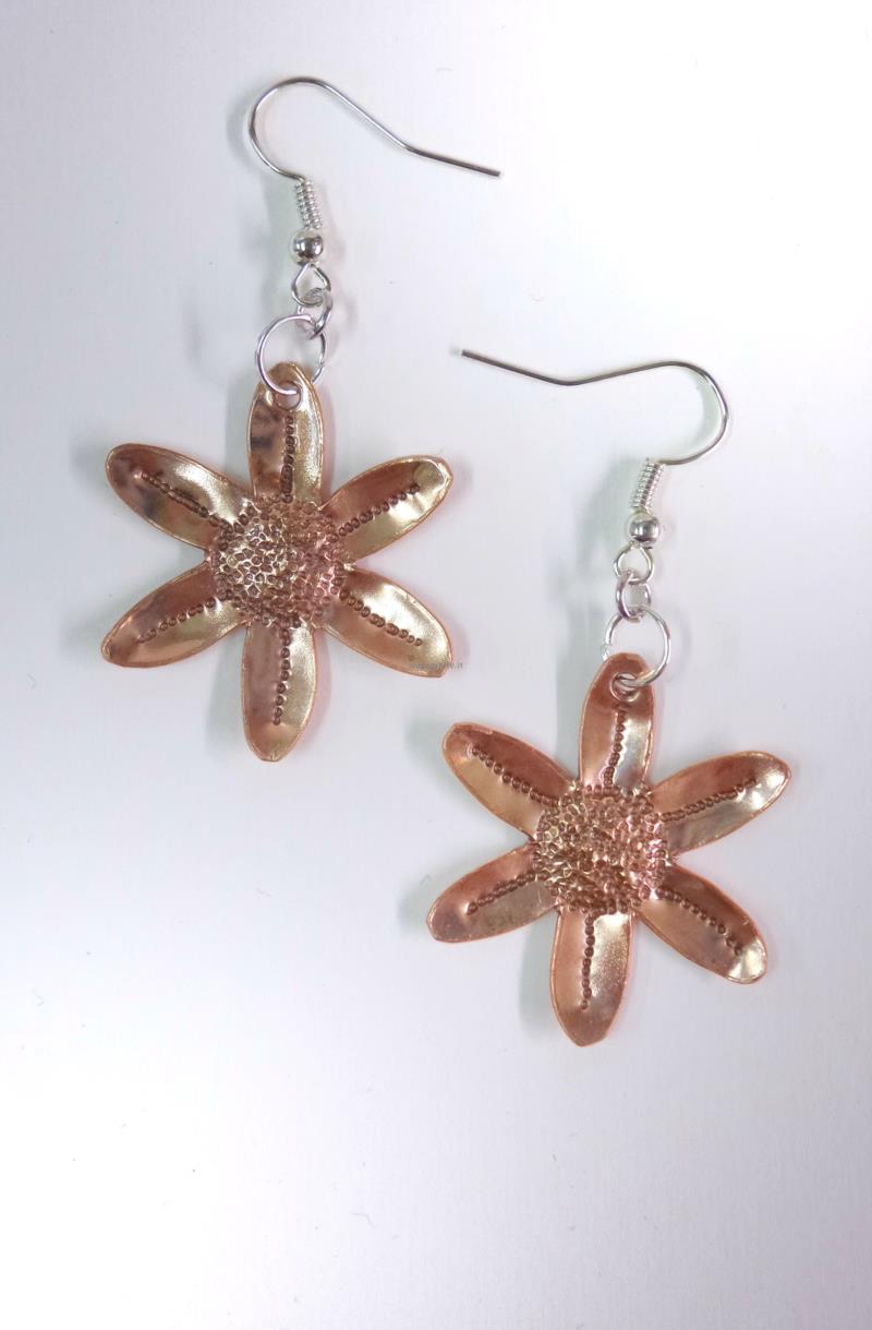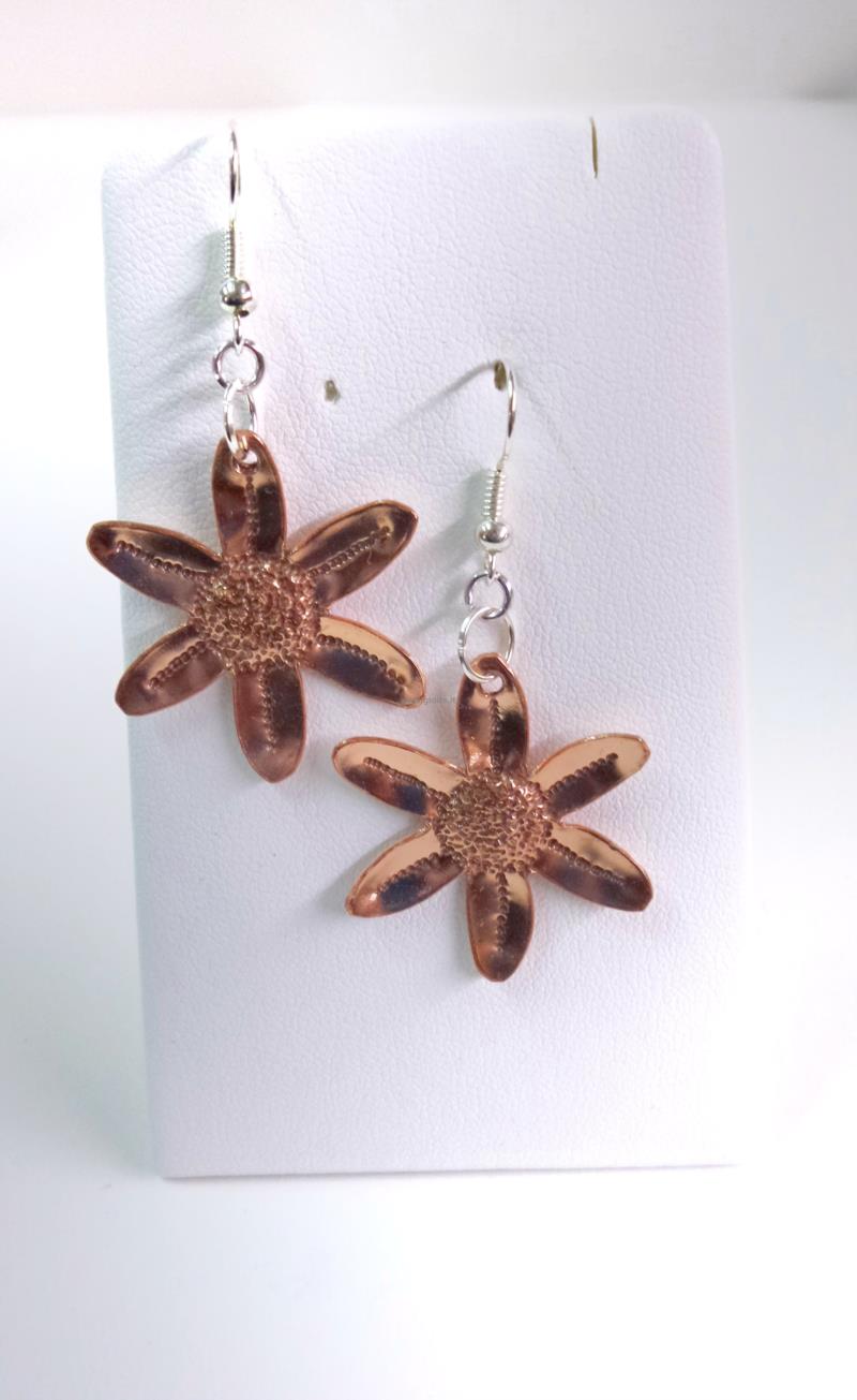 Orecchini Primula in rame, martellato, puntinato,sbalzato, intagliato e lucidato. Misura diametro cm 3 con monachelle in silver. Il metallo essendo martellato e sbalzato sviluppa dei giochi di luce ed ombra, questo con la più piccola variazione di luce, illumina il viso. E' un elemento armonioso e gioioso. Ogni manufatto viene lavorato interamente a mano, pezzi unici irripetibili. I metalli non si ossidano rimangono inalterati nel tempo. Collana laccio in cotone cerato.