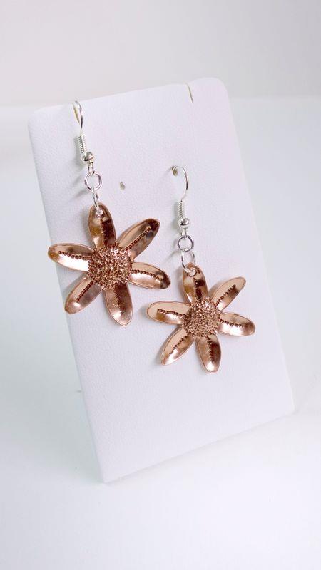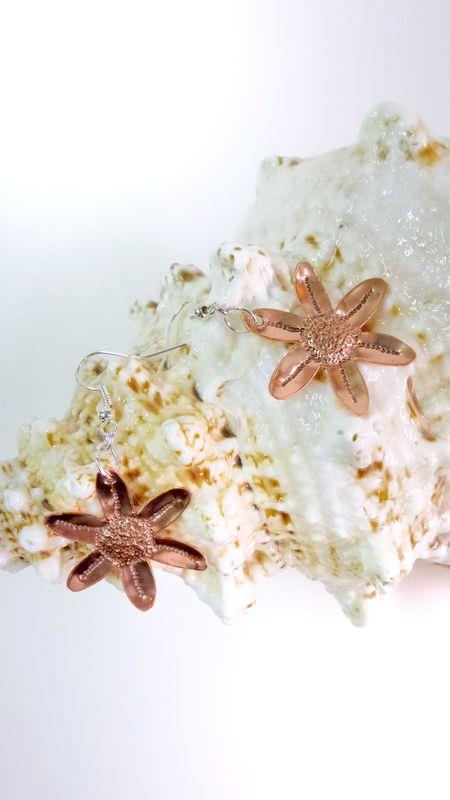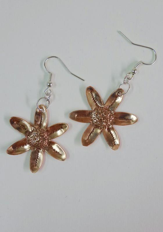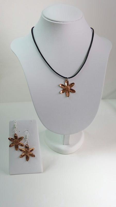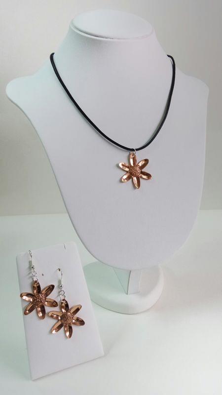 Collana Primula in rame, martellato, puntinato, sbalzato, intagliato e lucidato. Misura diametro cm 3 con laccio in cotone cerato . Il metallo essendo martellato e sbalzato sviluppa dei giochi di luce ed ombra, questo con la più piccola variazione di luce, da luminosità. E' un elemento armonioso e gioioso. Ogni manufatto viene lavorato interamente a mano, pezzi unici irripetibili. Orecchini con monachella in silver, i metalli non si ossidano rimangono inalterati nel tempo.
