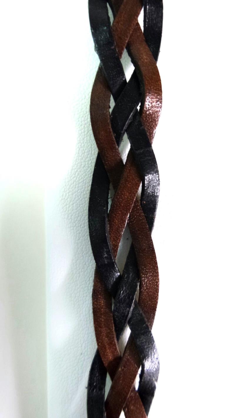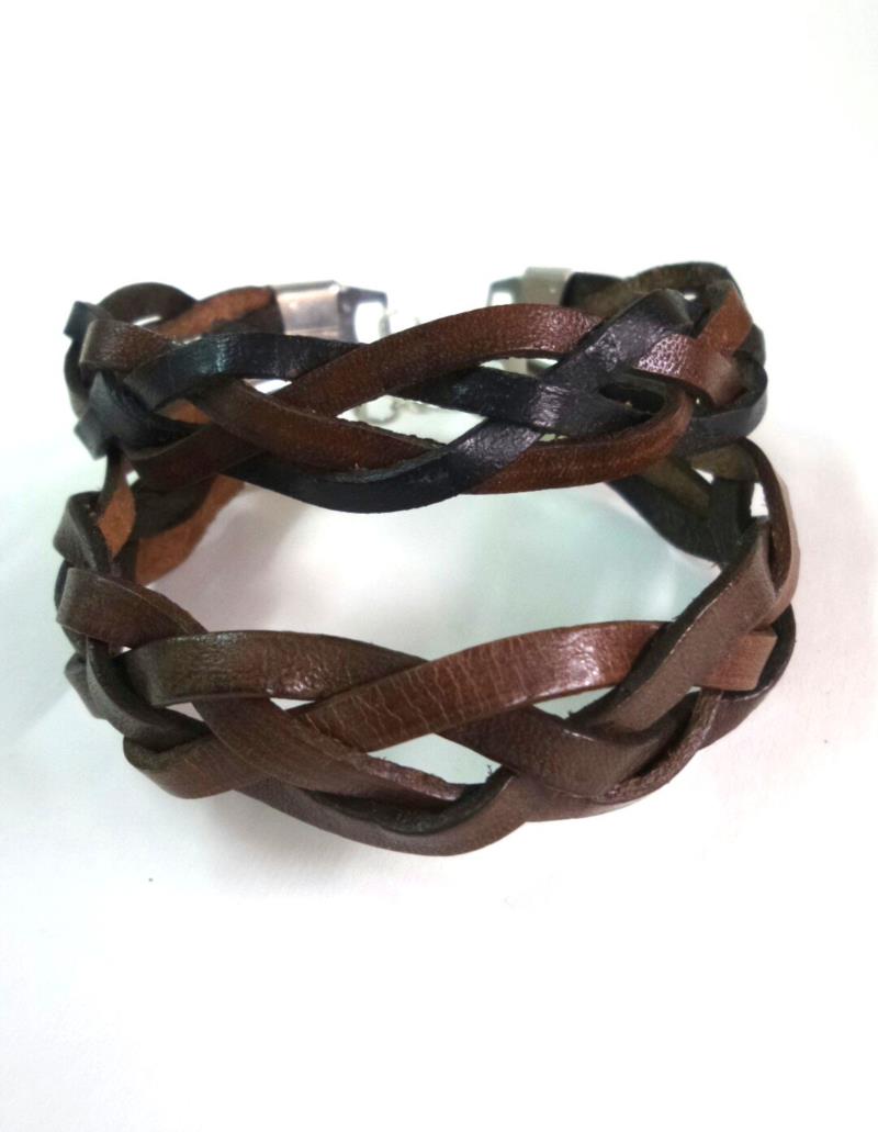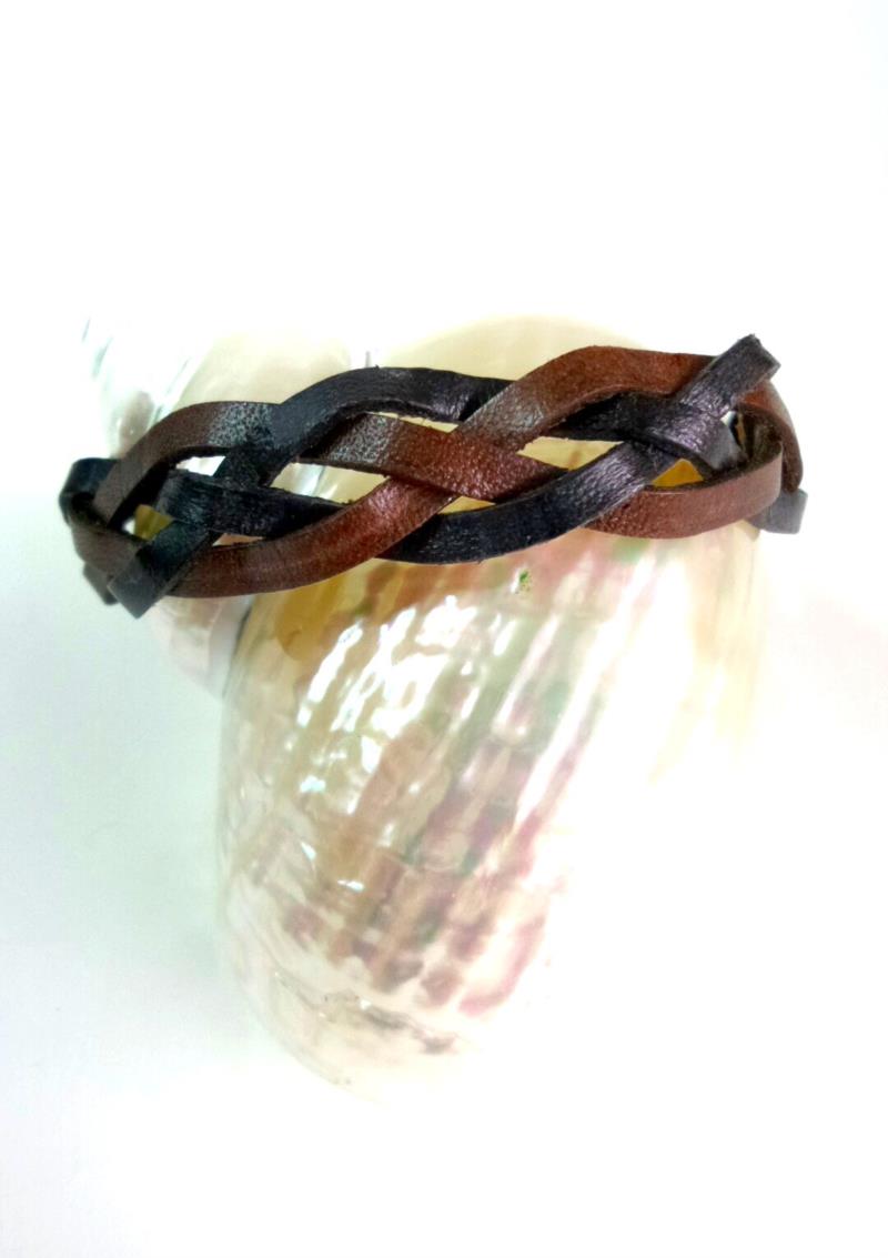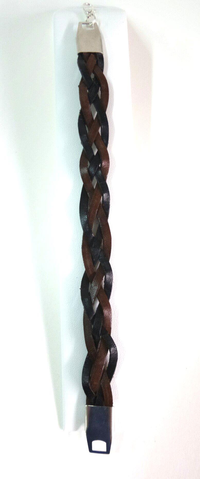Bracciale in pelle intrecciato a quattro fili bicolore, con finale in silver anallergico. La treccia è larga cm due, la misura della lunghezza, sotto citata e compresa la chiusura. E' un bracciale avvolgente, elegante per una pesona sicura ed intraprendente, si adatta benissimo ad ogni esigenza. Realizziamo anche misure su richiesta.