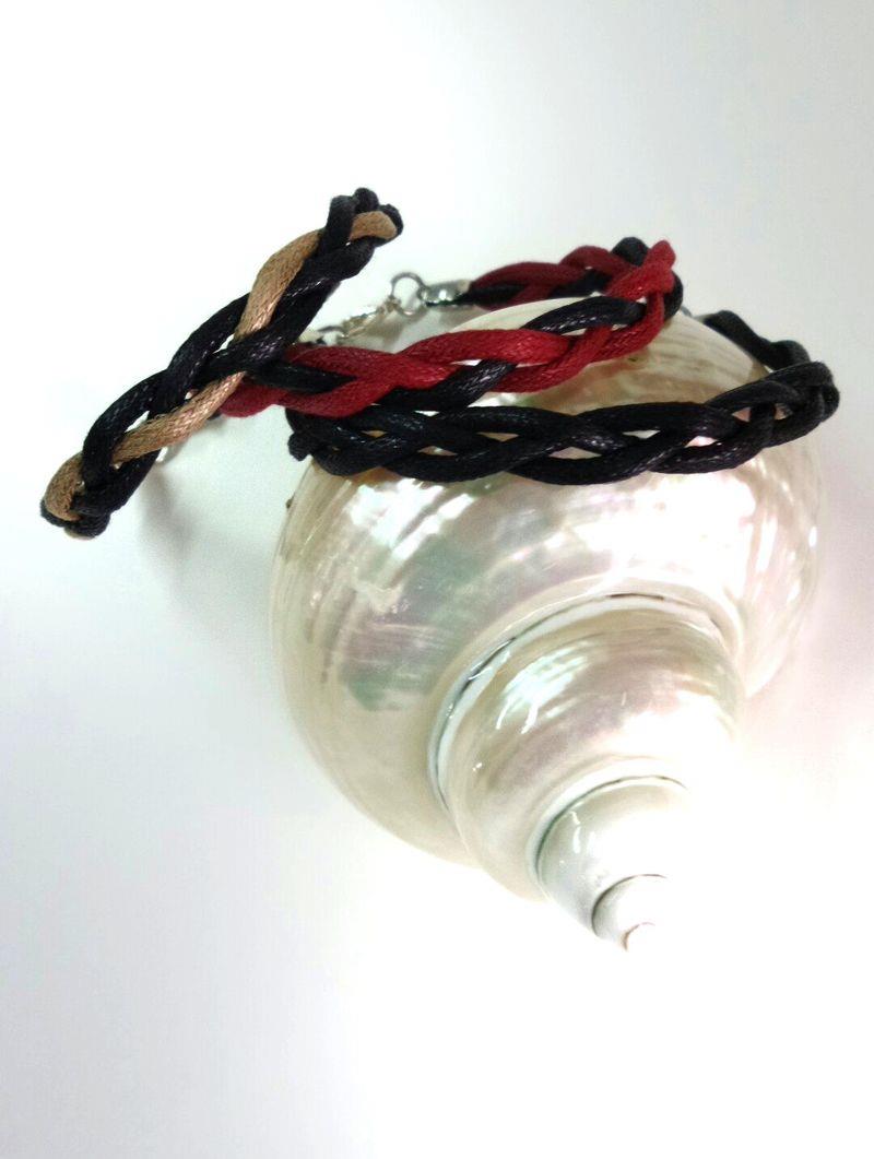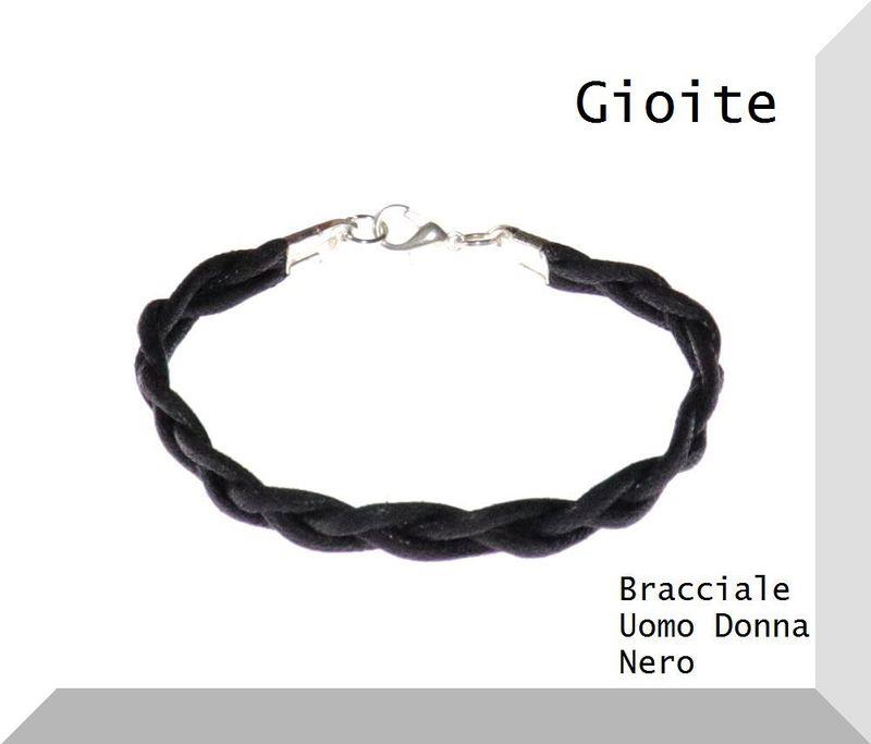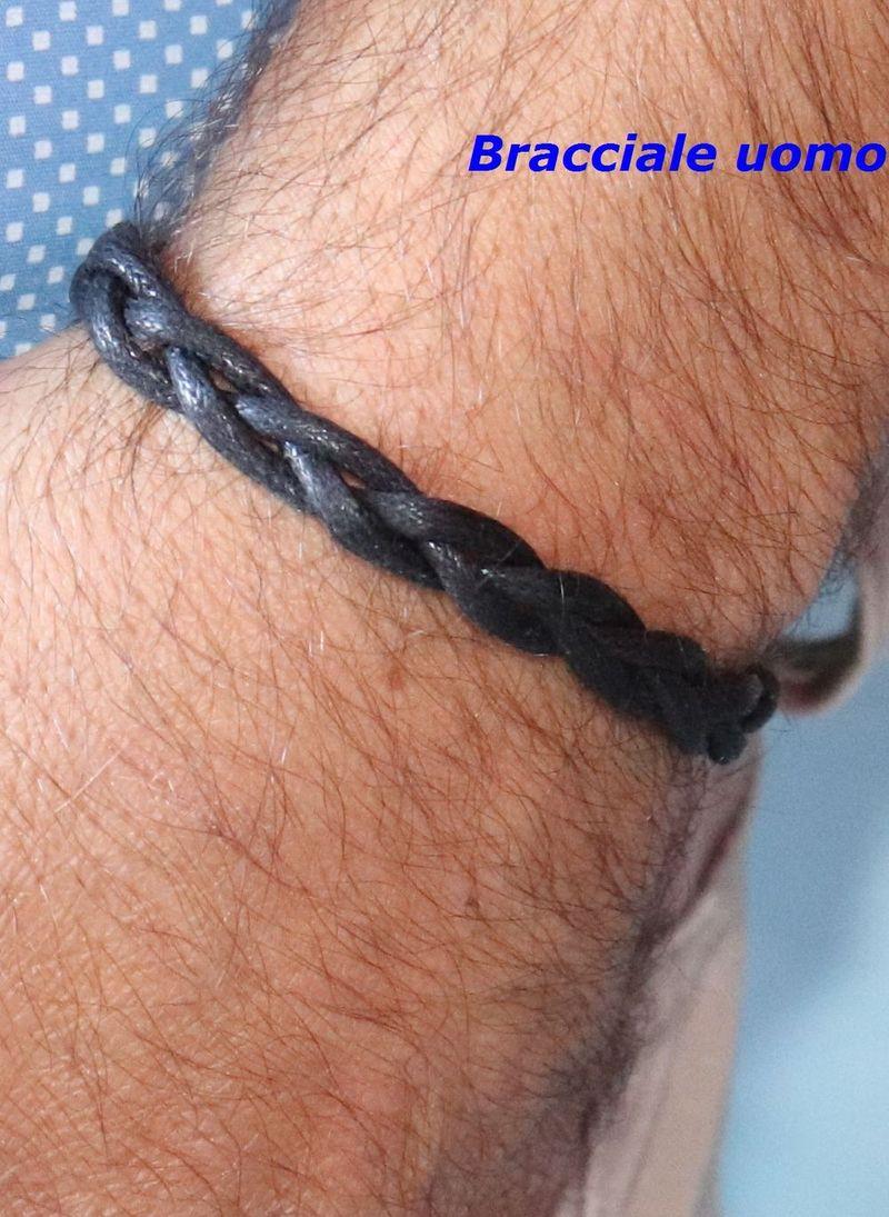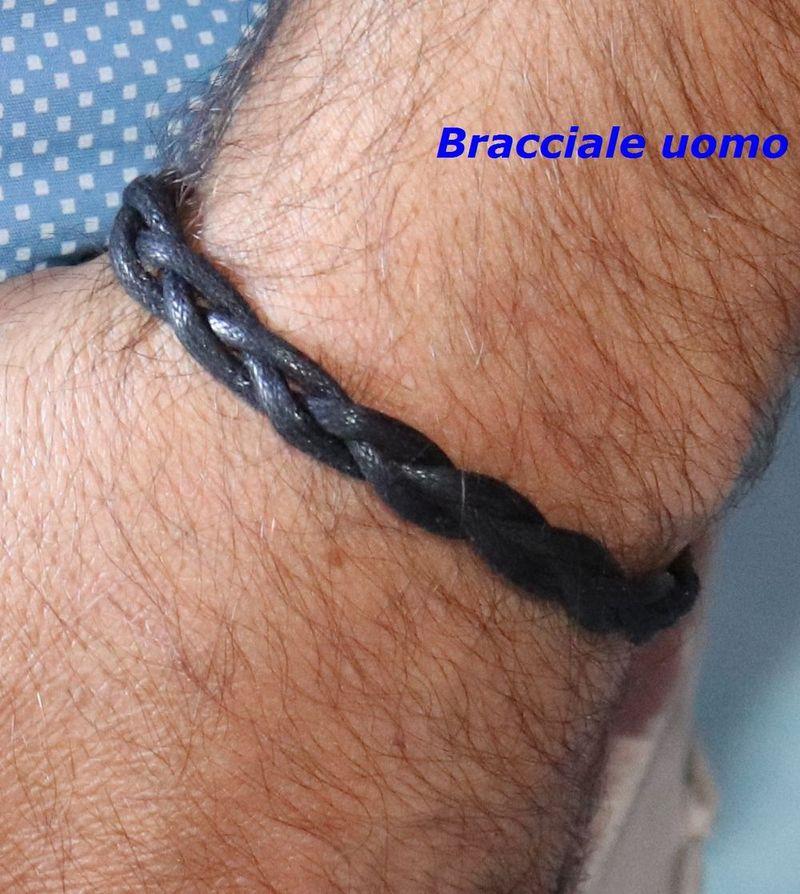 Bracciale in cotone cerato naturale, intrecciato a mano, con chiusura raccolta in silver, quindi anallergico. Essendo un bracciale in tessuto si puo lavare, è molto pratico, sportivo e facile da indossare, dai più piccoli hai grandi. Varia; dal molto colorato, al tenue, al classico, la traccia è larga mm. 0,8 con una caduta sul polso perfetta. Le misure comprendono, la chiusura. Si realizzano anche su richiesta. Colore nero.