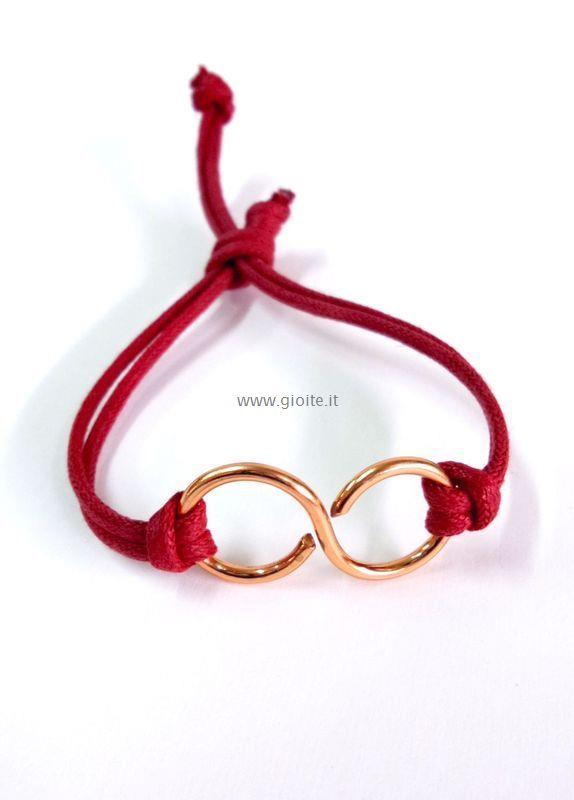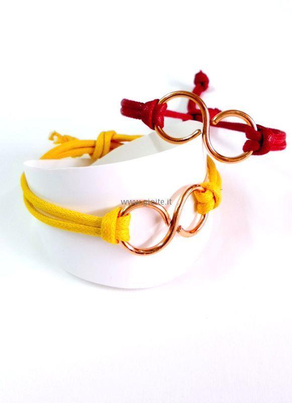 Il braccialetto è formato dal laccio in cotone italiano, annodato con al centro il simbolo dell'infinito in metallo di rame ( non si ossida ) lavorato a mano, artigianalmente. Ogni elemento decorativo è un pezzo unico.