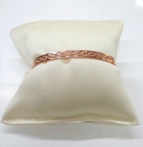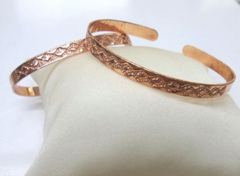 Bracciale in rame, a fascia regolabile. Realizzato a mano anallergico e inossidabile con motivi decorativi a rombetti riportati sulla fascia centrale. le misure sono: diametro cm 16 altezza della fascia di rame cm 0,5  spessore del rame 0,01. Misura media per donna, pezzi unici manufatti realizzati da Gioite.