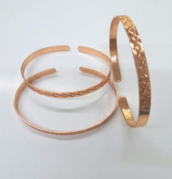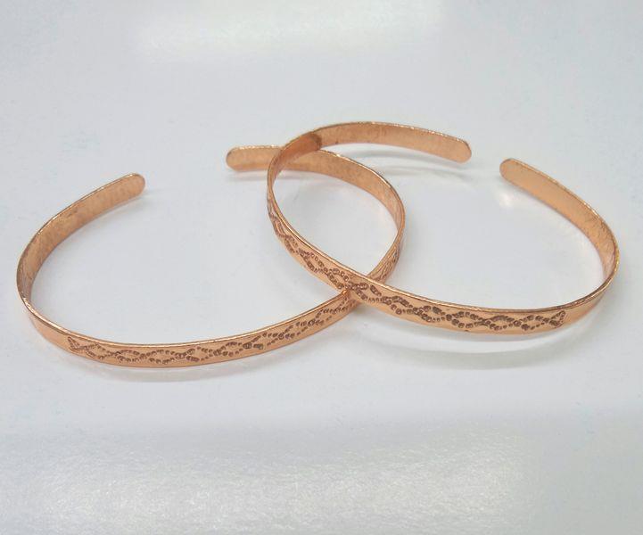 Bracciale in rame, a fascia regolabile. Realizzato a mano anallergico e inossidabile con motivi decorativi a rombetti riportati sulla fascia centrale. le misure sono: diametro cm 16,5 altezza della fascia di rame cm 0,5  spessore del rame 0,01. Misura media per donna/ uomo, pezzi unici manufatti realizzati da Gioite.