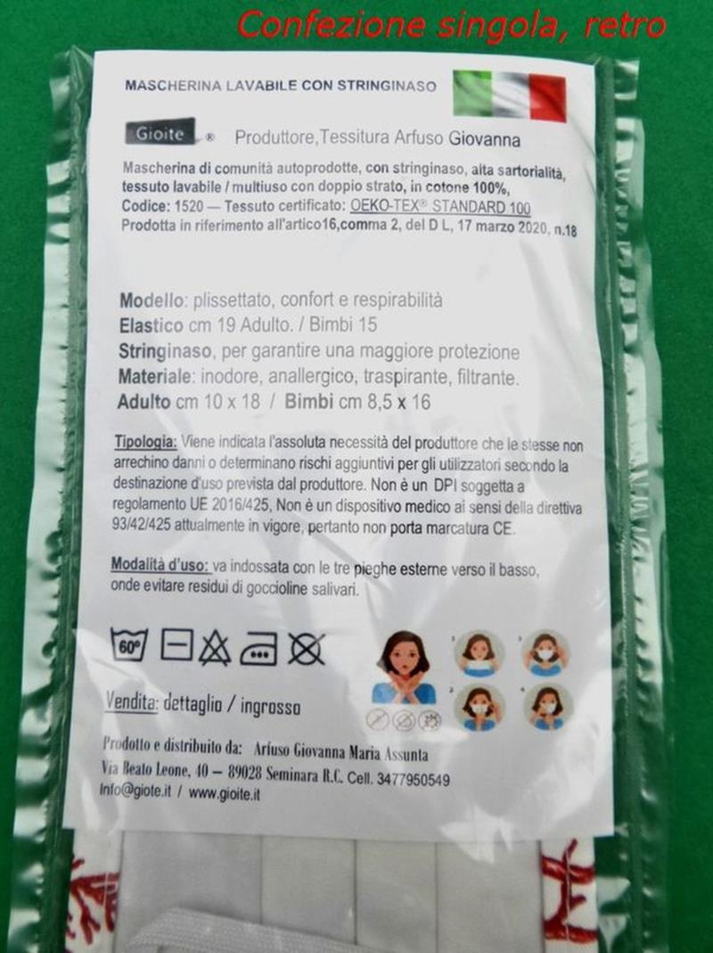 MASCHERINA LAVABILE ANTI APPANNAMENTO IN COTONE FILTRANTE PROTEZIONE, Tessuto certificato: OEKO-TEX® STANDARD 100 alta sartorialità € 3,50