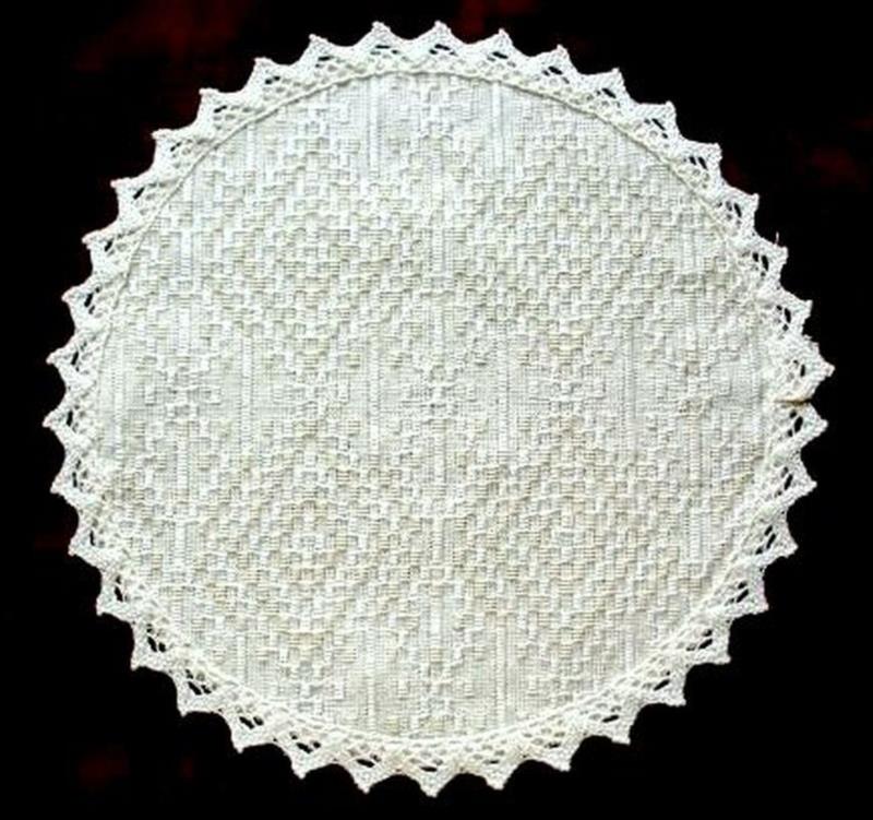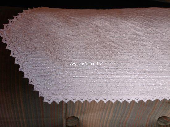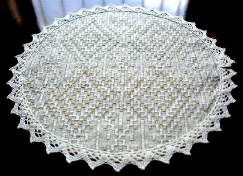 Caratteristiche: Centrino di seta, rifinito con pizzo rotondo, tessuto ordito, in cotone naturale e trama, in seta sintetica, filati 100% naturali. Con motivi decorativi tradizionali della Magna Grecia, lavorazione a rombetti incastrati. Tessuto con riflessi di lucentezza di colore avorio.